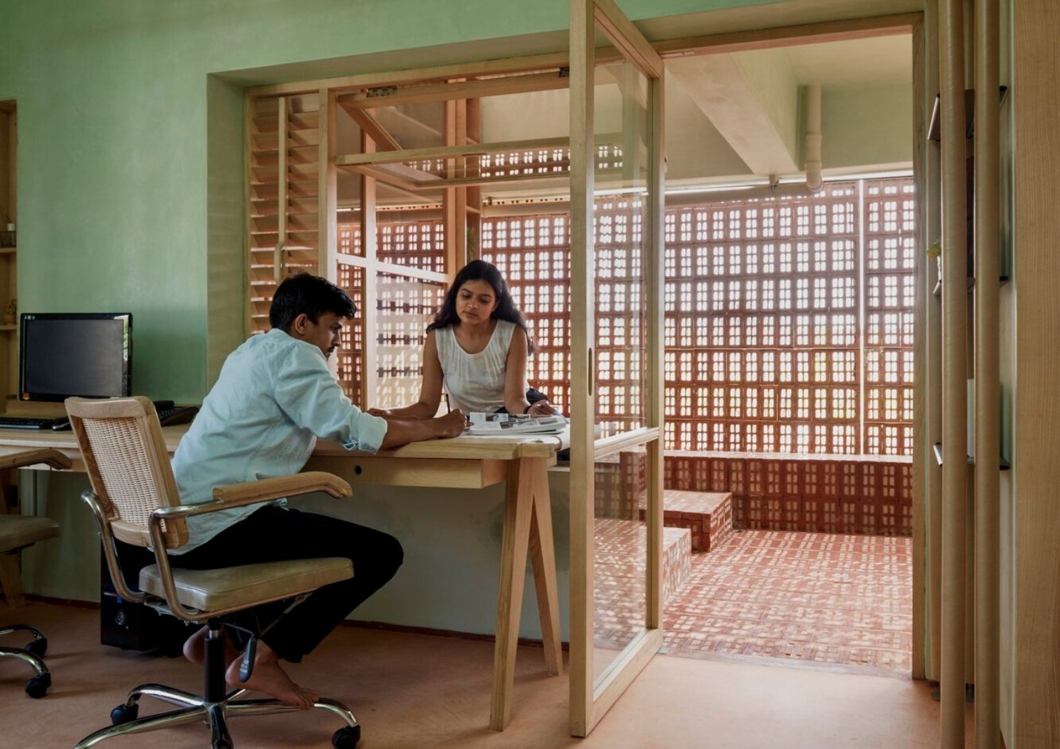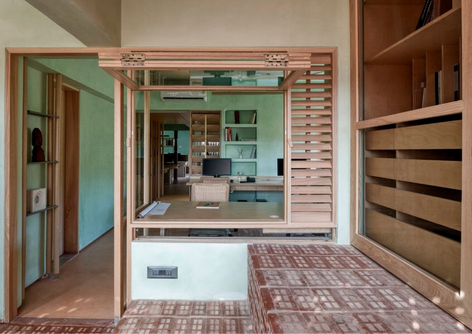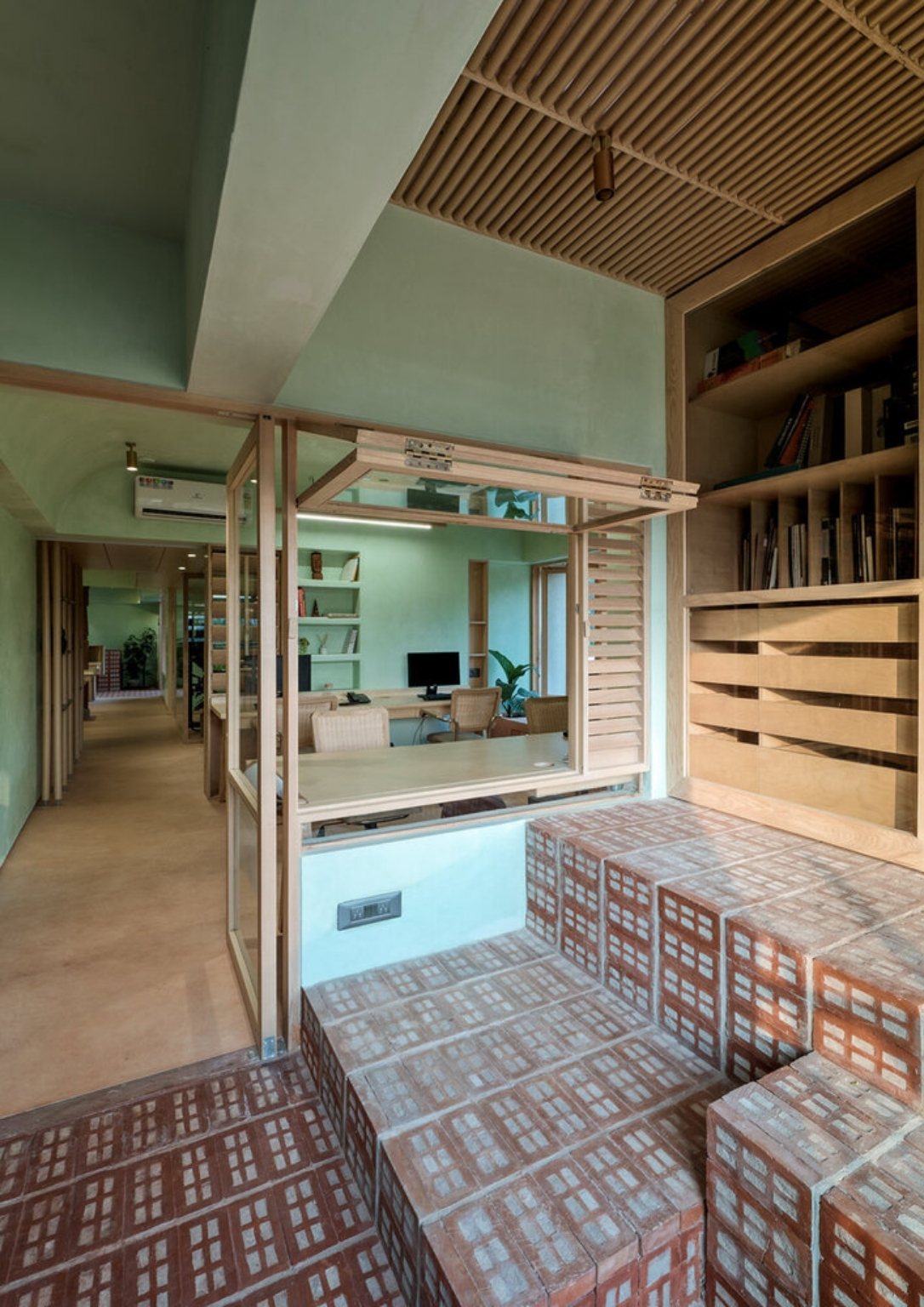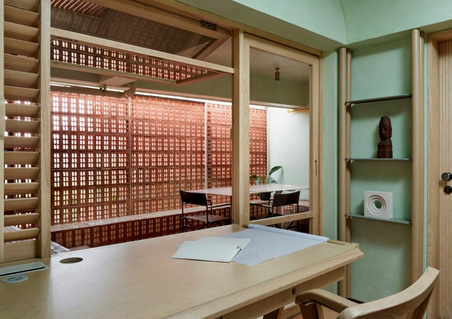 The choice of pale green lime wash plaster goes well with perforated bricks, giving off a peaceful atmosphere as soon as you enter the office. The colors green and brown emulate the natural colors that envelop the site. The lime wash paint continues to the ceiling radiating a seamless vision of the space. The consistent use of light oak for all the woodwork helps the consistency of the space’s palette. As a call to minimize material usage, the team utilized recycled paper tubes as shutters, backrests, and open shelves supported with some modification. The floors are terracotta-colored concrete to match the bricks.