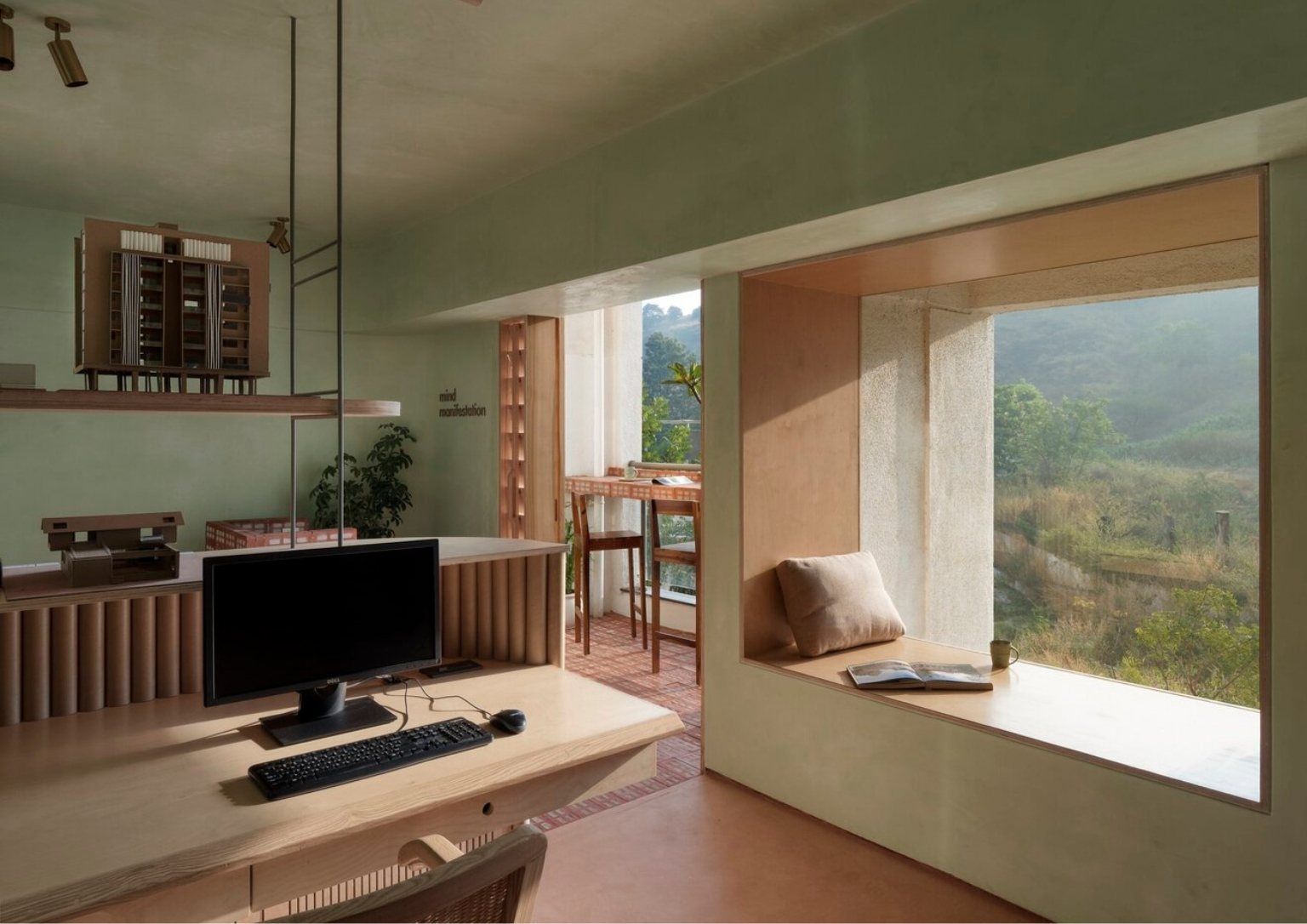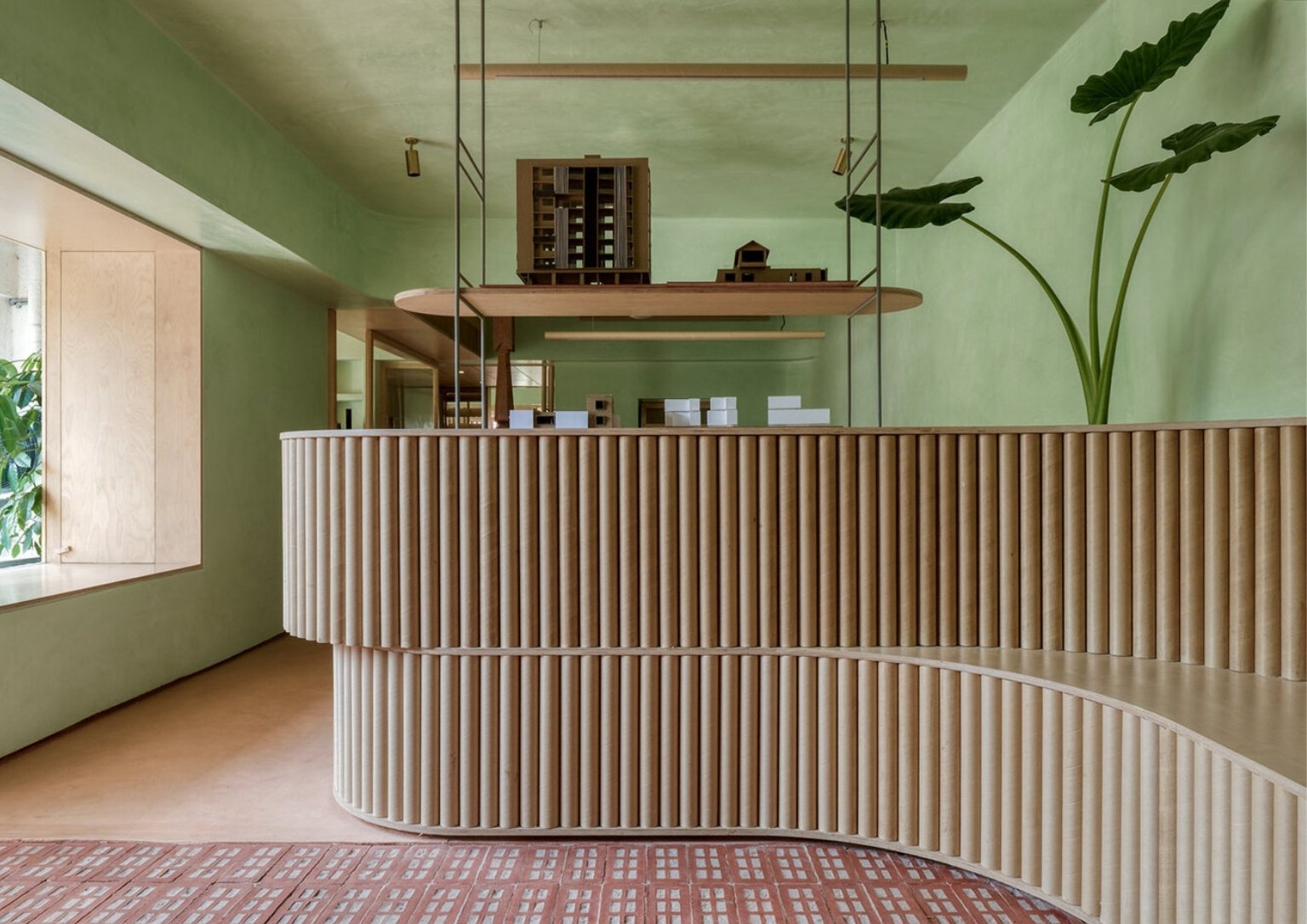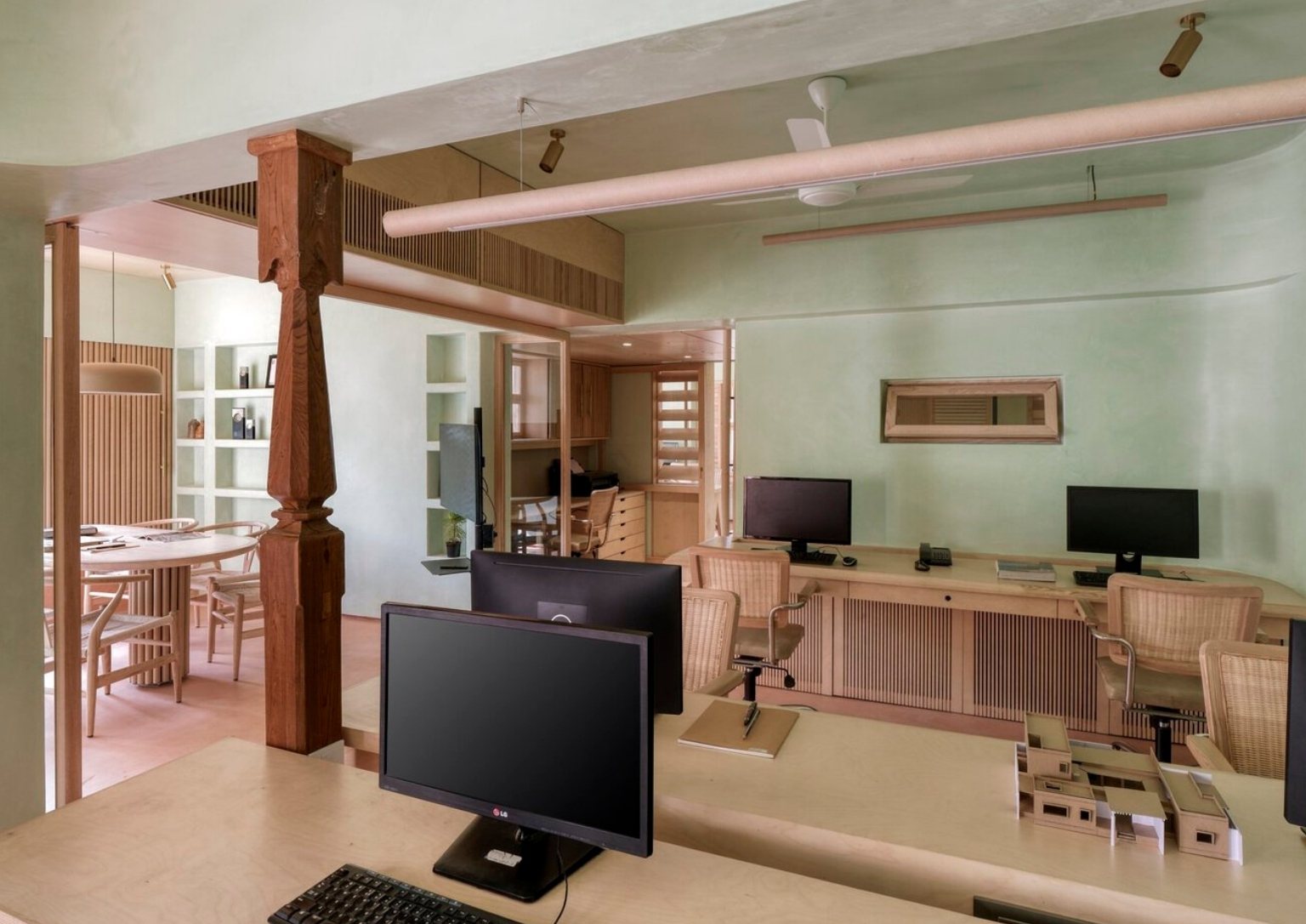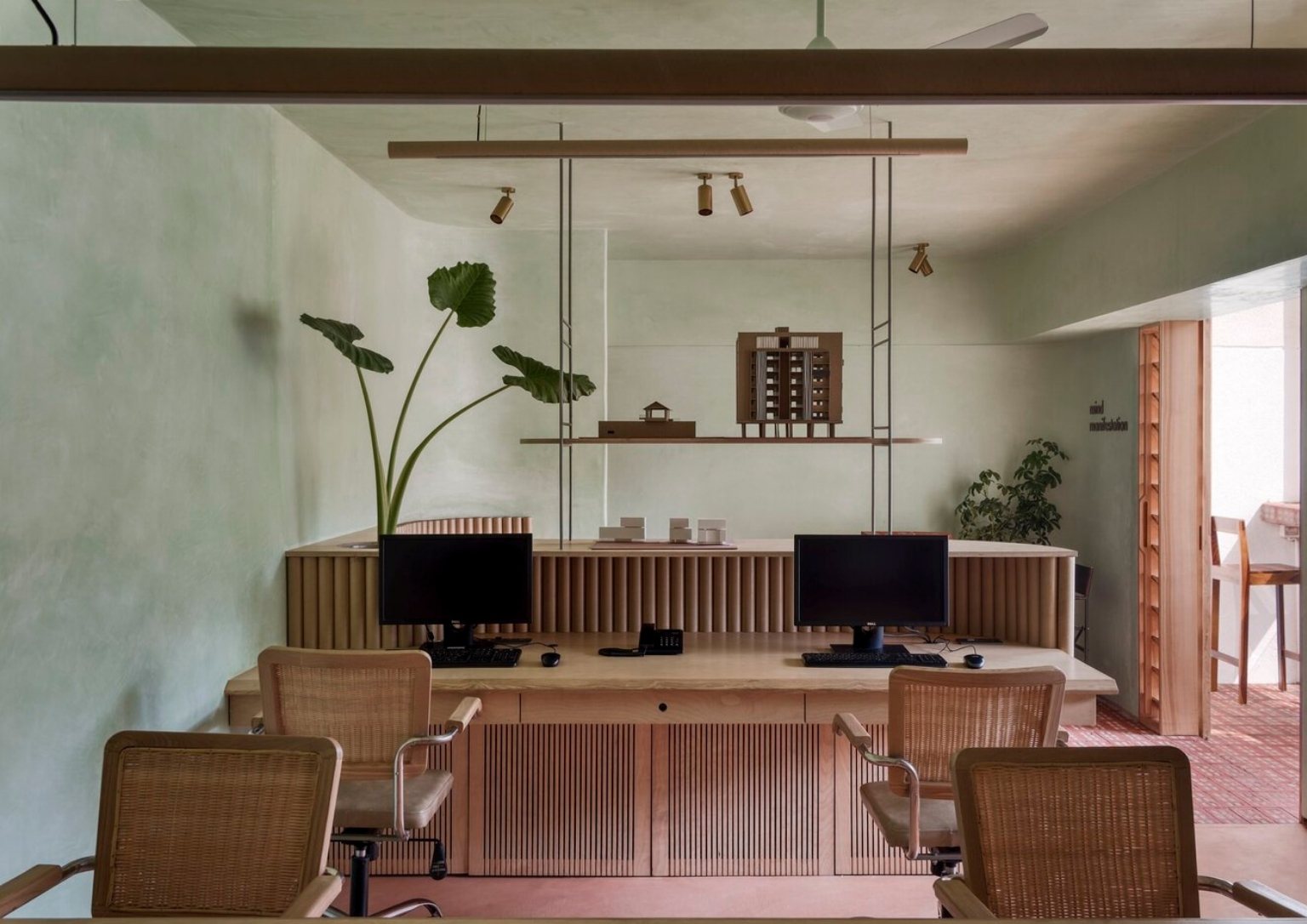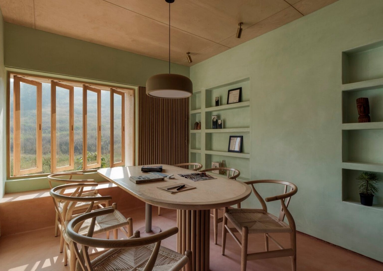The choice of pale green lime wash plaster goes well with perforated bricks, giving off a peaceful atmosphere as soon as you enter the office. The colors green and brown emulate the natural colors that envelop the site. The lime wash paint continues to the ceiling radiating a seamless vision of the space. The consistent use of light oak for all the woodwork helps the consistency of the space’s palette. As a call to minimize material usage, the team utilized recycled paper tubes as shutters, backrests, and open shelves supported with some modification. The floors are terracotta-colored concrete to match the bricks.