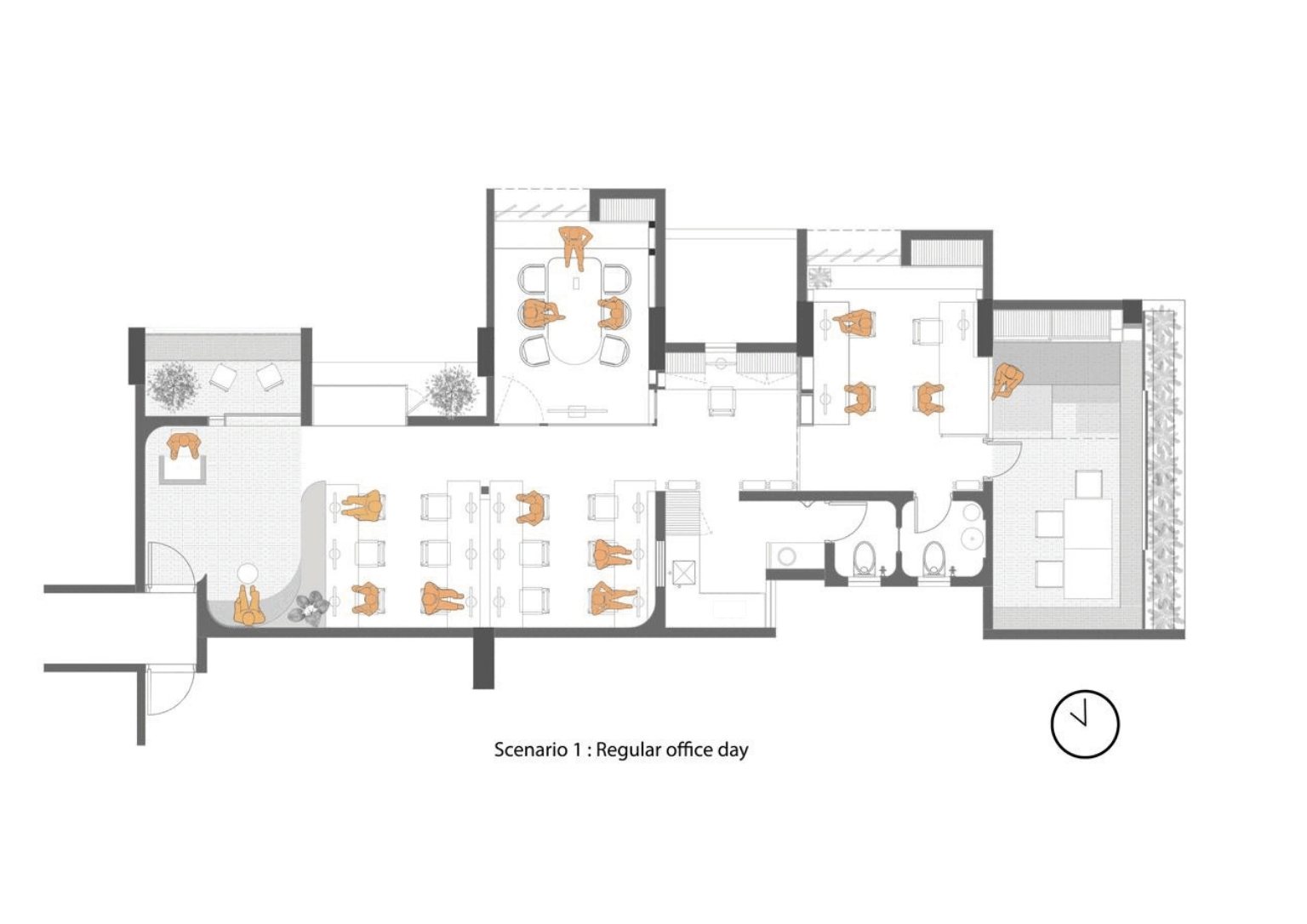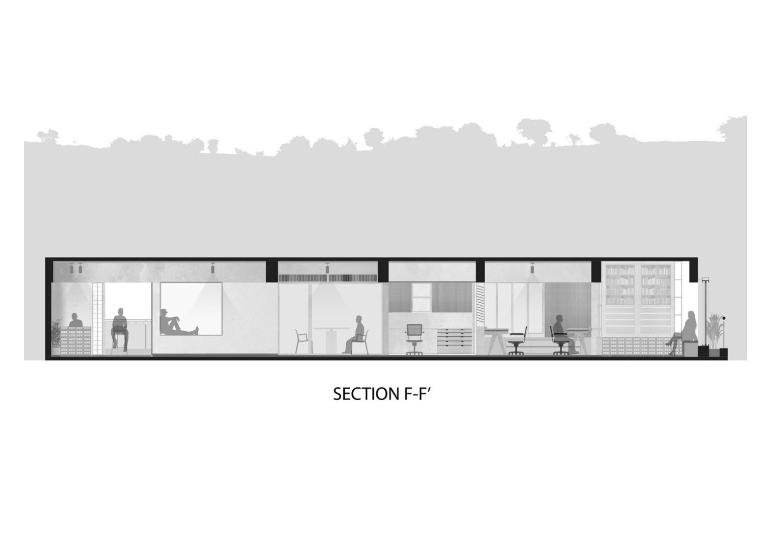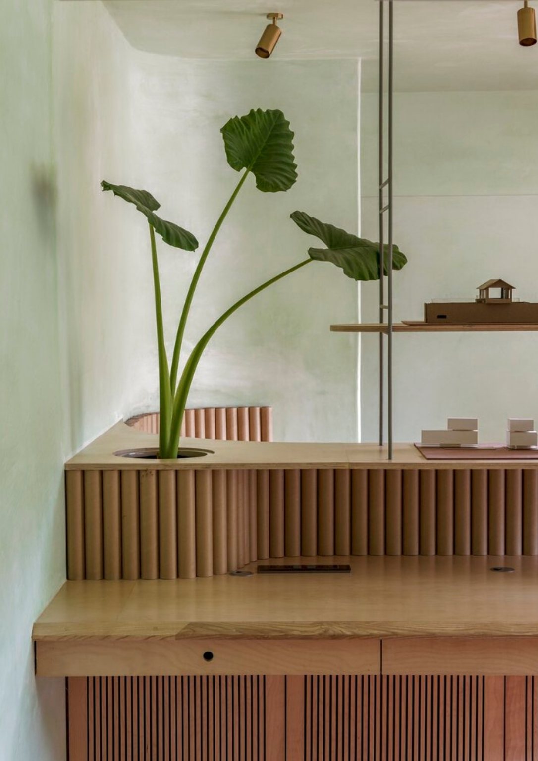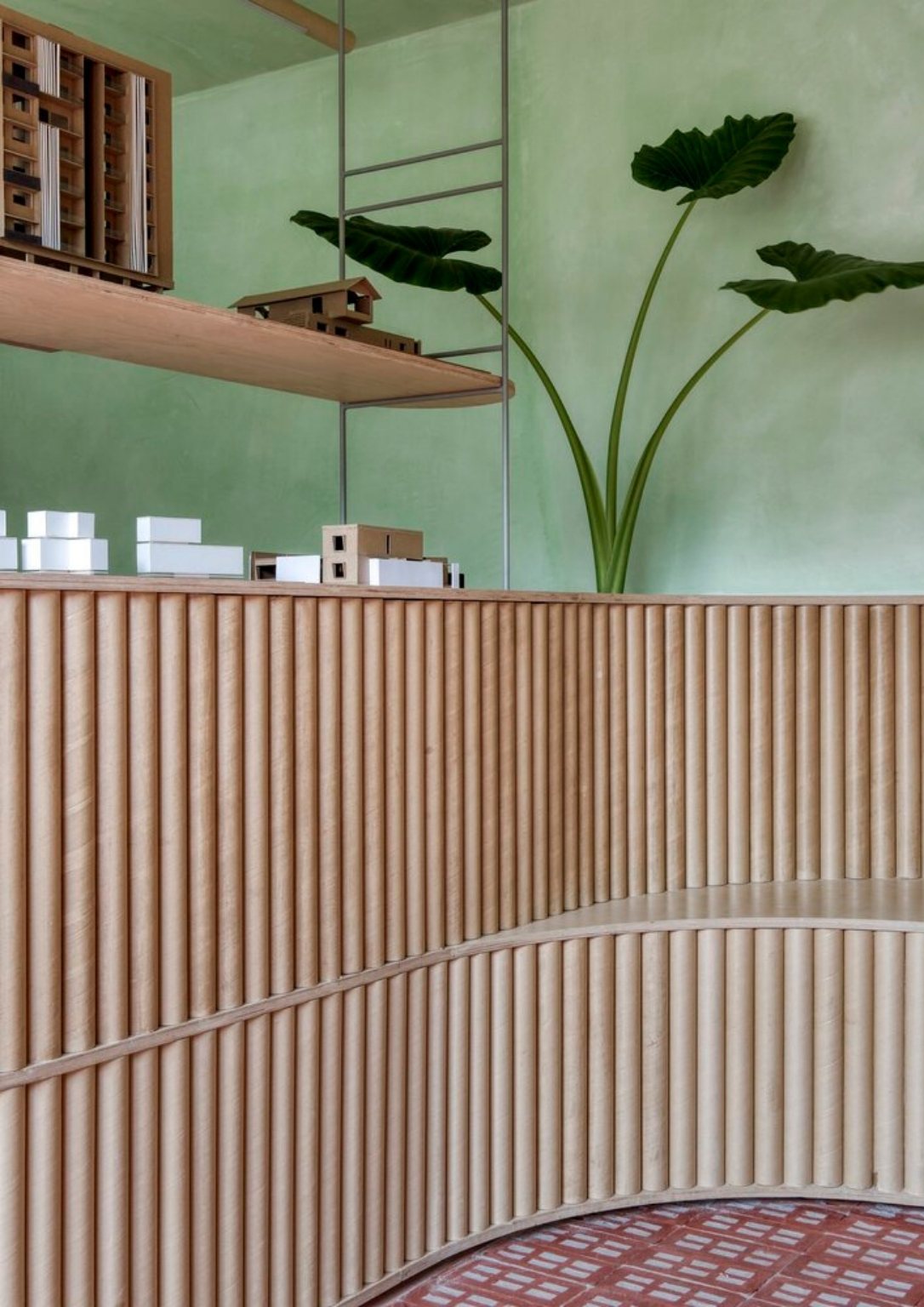 The choice of pale green lime wash plaster goes well with perforated bricks, giving off a peaceful atmosphere as soon as you enter the office. The colors green and brown emulate the natural colors that envelop the site. The lime wash paint continues to the ceiling radiating a seamless vision of the space. The consistent use of light oak for all the woodwork helps the consistency of the space’s palette. As a call to minimize material usage, the team utilized recycled paper tubes as shutters, backrests, and open shelves supported with some modification. The floors are terracotta-colored concrete to match the bricks.