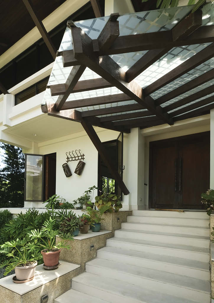 The lanai sits between the living area and the garden. Raw concrete trimmings, as seen on the columns and windows, accentuate the white plaster finish. A standout for this veranda are the numerous potted plants scattered across counter tops, inside the table, and across the floor. The wind chimes and bird cage hanging right above adds a touch of ambience to the space. It’s an organic display of a romance with nature with a lanai design that integrates these key elements.