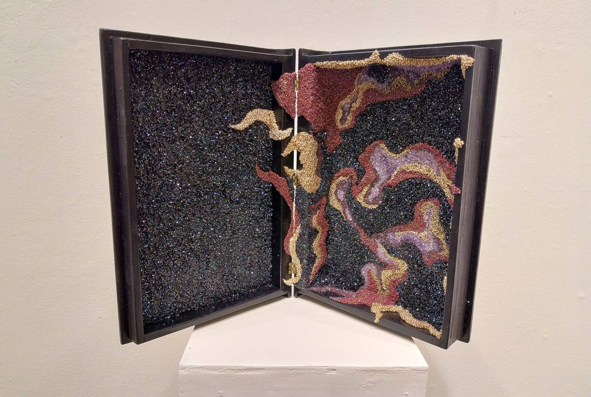 She uses found objects in much of the exhibit to show this unique way of perceiving things. Many of them use a combination of dark hues and gold to create swirling portal-like worlds in front of us. Her intent was to create a magical aura in each object to represent their possibilities.