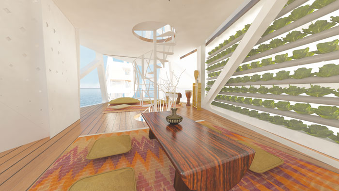Each structure is anchored to the seabed by a column on which water turbines are attached—a year 2050 version of a house on stilts. The houses are clustered along the coast with their power collection interlinked so they can produce electricity for the whole community. Excess power can be sold to power-plants to be redistributed to nearby cities, providing the fisher-folk an alternative means of income.