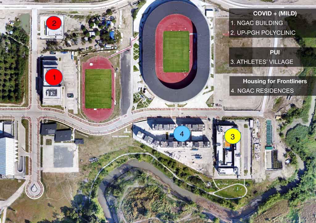 The UP-PGH polyclinic will also be ready for health emergencies. Dizon shares that once utilized, provincial and regional department health officials will monitor this. “The idea here is to allow our hospitals breathing room and bring the PUIs and PUMs in New Clark City.” In the event that the number of COVID-19 cases does not deplete, the Athletic Stadium will be utilized as a space for quarantine patients, with BCDA looking at WTA Design Studio’s design for quarantine tents. Architect Royal Pineda of BUDJI+ROYAL Architecture+Design, who designed New Clark City’s Phase 1 facilities, suggests that the Aquatics Center can serve as another auxiliary building for the medical offices and staff. “It has the proper distance from other isolation facilities making it distant yet still adjacent for medical service. It can also be the control point in entering the complex.”
