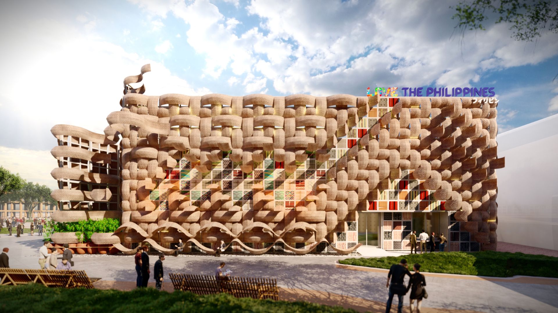 Positioned at the forefront of the Expo grounds, the pavilion’s facade features a tapestry of hundreds of textiles crafted by over 2,000 weavers across 200 communities. These weavers, empowered by traditions passed down for generations, recount the stories of their everyday lives.