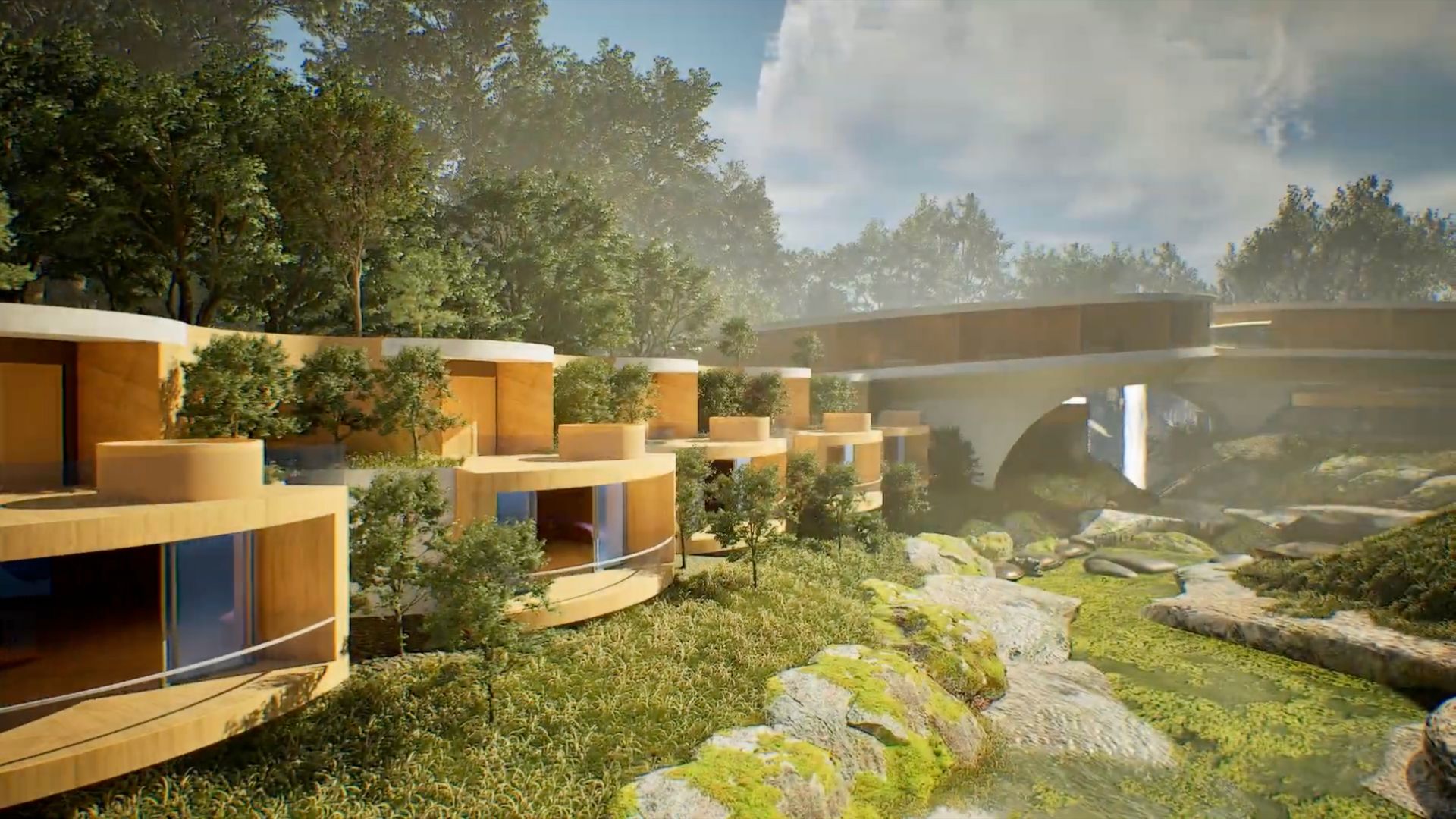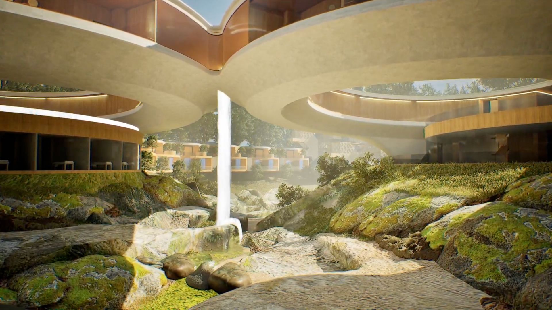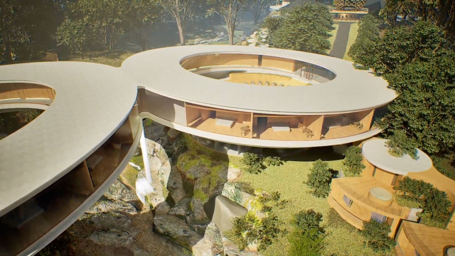 The design centers on two circular buildings that appear to “kiss” at a pivotal connection point. “When the two circles kiss, we recreated and celebrated the drama of the waterfall, which drops exactly at the same place of the existing stream and waterfall, highlighting this natural wonder and its sounds,” Calma explains. This deliberate alignment emphasizes the waterfall’s presence, enhancing its impact.
