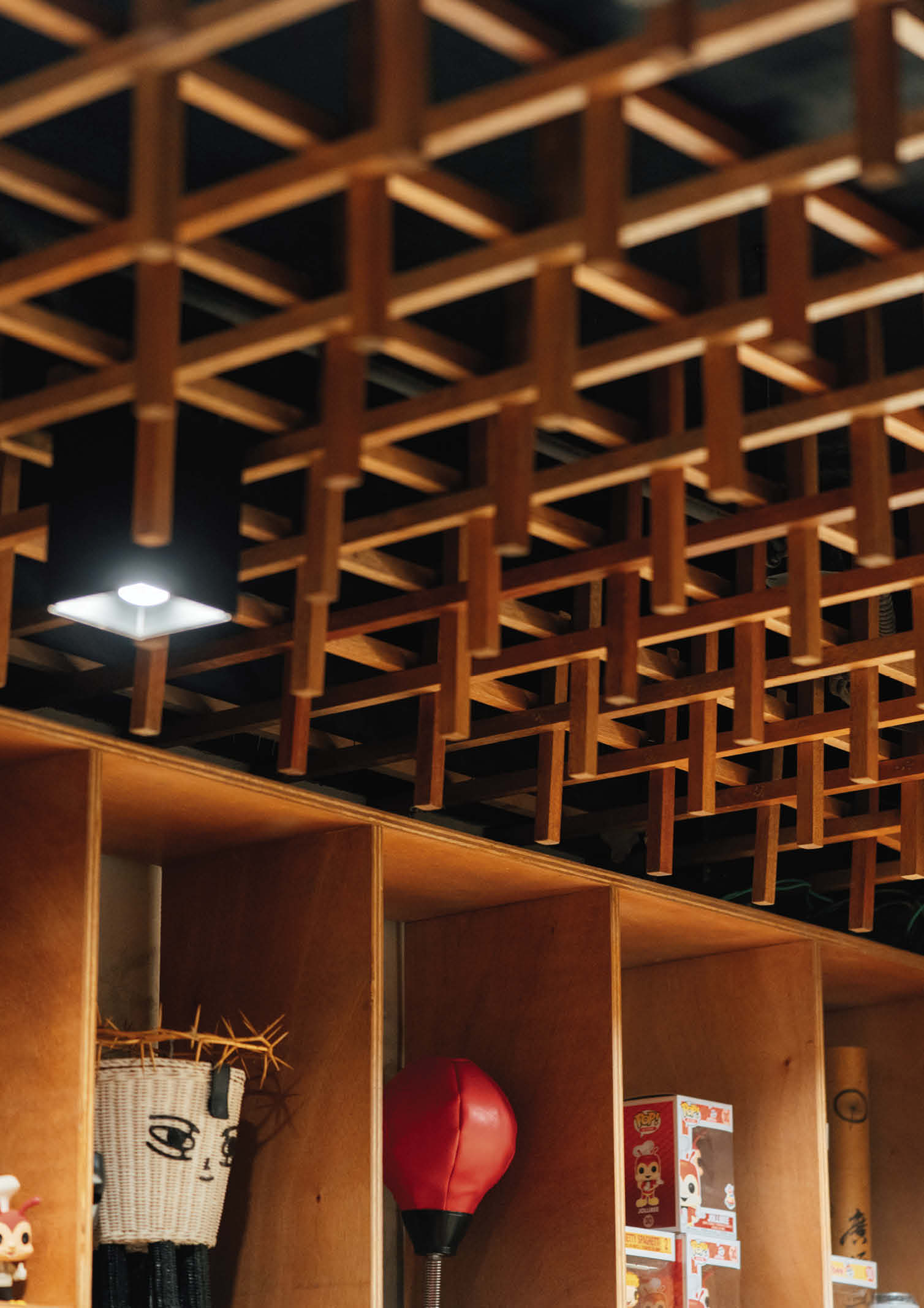 “We lined its walls with plywood shelves that highlight its natural grain and with its edges visible. These same shelves act as partitions, offering some privacy for a small office at the back. We also designed custom furniture pieces that feature plywood as the core material: a sofa, worktables, and lightweight movable stools. We also used tanguile wood studs to create a grid in the ceiling connecting to the lines created by the shelves,” explains Serrano.