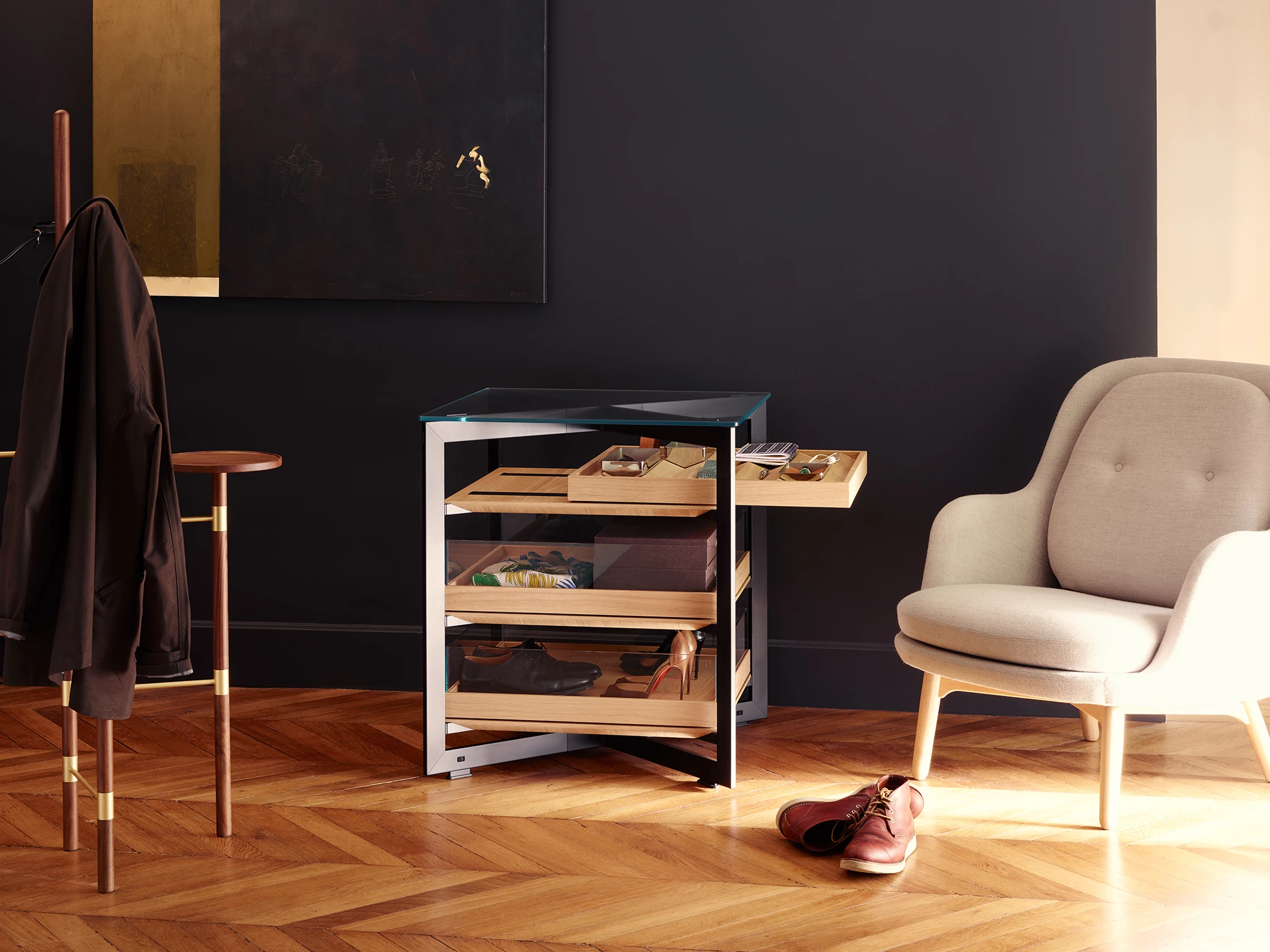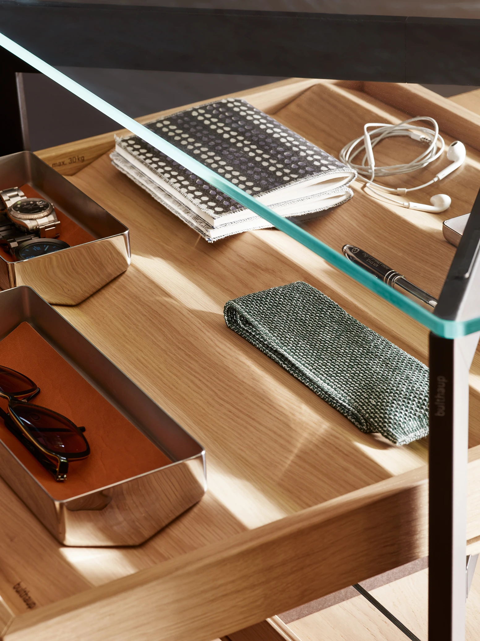 Glass components may be used either as tabletops, shelves, or pullout tray complements for this multipurpose system. The transparent surface enhances visual clarity and spatial lightness while allowing efficient organization of daily essentials and cherished mementos. The 10-mm-thick glass pane features polished edges and corners, balancing transparency with precision and safety.