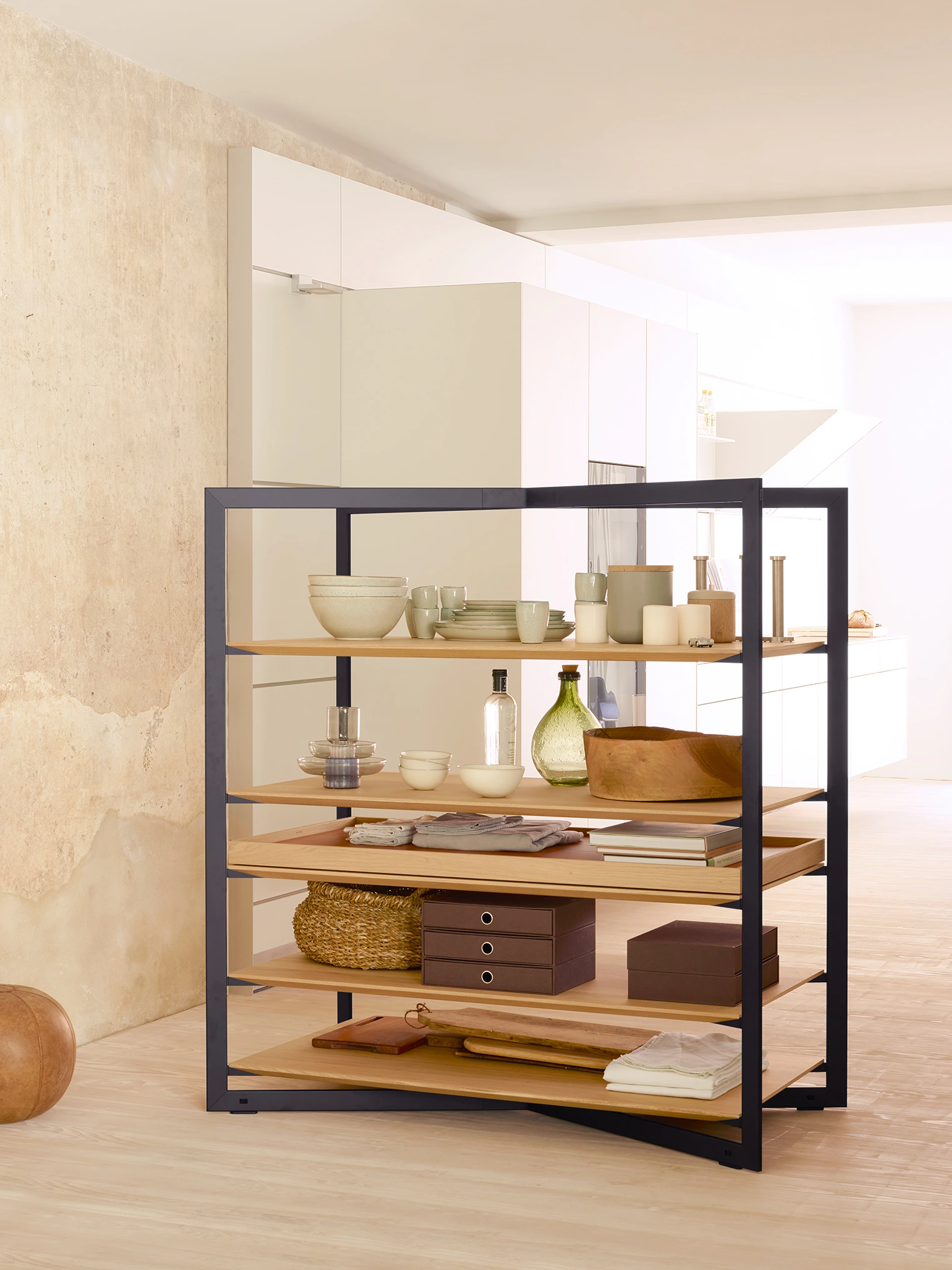 The b Solitaire’s versatility is defined by three fundamental elements that can be assembled in numerous ways: a shelf, a grid, and a pullout tray. The classic fixed shelving is available in three timeless finishes—solid oak, stainless steel, and glass—each chosen for its longevity and tactile qualities. Natural wood brings warmth to any space, with its beauty evolving gracefully over time. Stainless steel, valued for its long-term sustainability, is a sensible choice that introduces restrained industrial elegance; its satin finish acquires character over time. The grid element, meanwhile, is offered in solid wood, filigree, or heat-resistant cast iron, lending both visual lightness and structural weight, as well as exceptional stability.