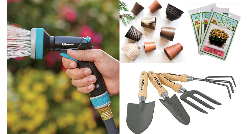 Complete their gardening essentials with Heim rubber pots, Ramgo seeds, Gilmour spray nozzle, and a set of gardening tools like a garden trowel, fork, cultivator, and transplanter from Truper.