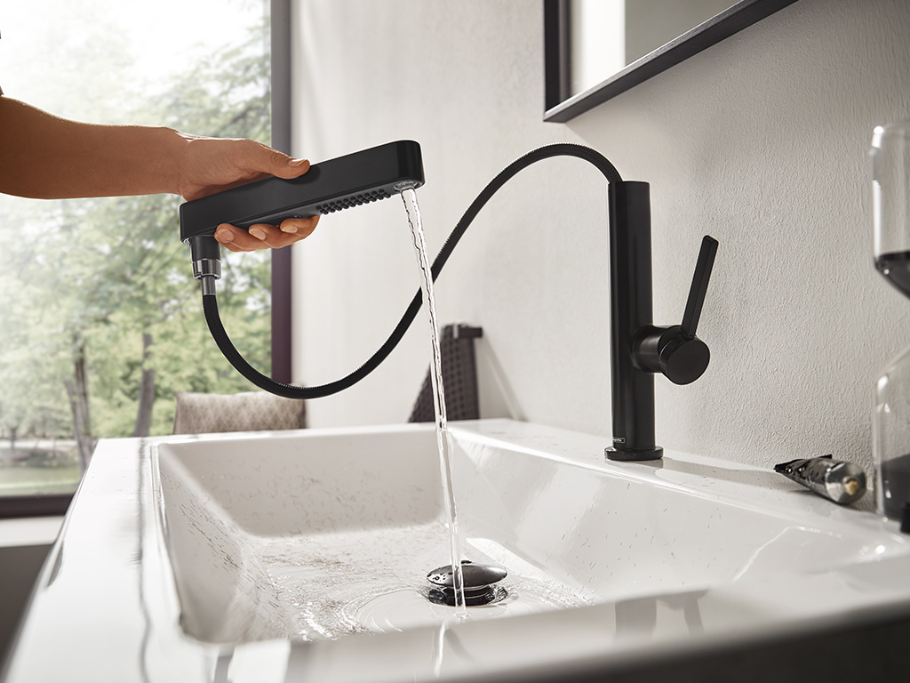 The hansgrohe Finoris faucet offers innovation, style, and flexible functions that will make household activities a breeze with its “Flex” variant, offering enough room to maneuver during your everyday chores. It features a pull-out faucet head with an action radius of 500 millimeters that can slide back seamlessly into its original position due to its magnetic retraction support. Simple activities like washing your hair or even cleaning the wash basin itself becomes trouble-free.