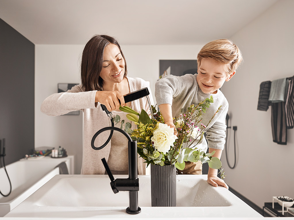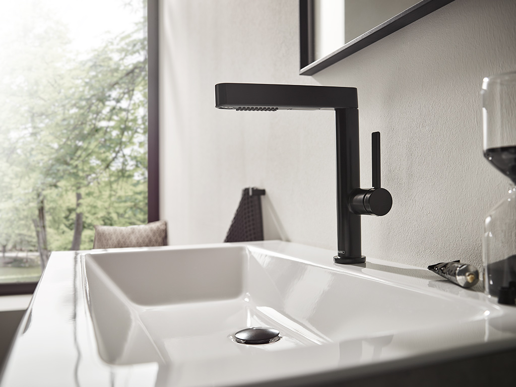 The complete faucet range can be combined with the hansgrohe Rainfinity shower solutions and the matching hansgrohe AddStoris accessory range.