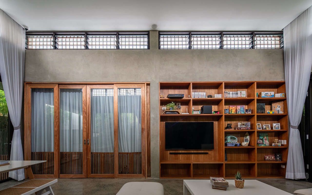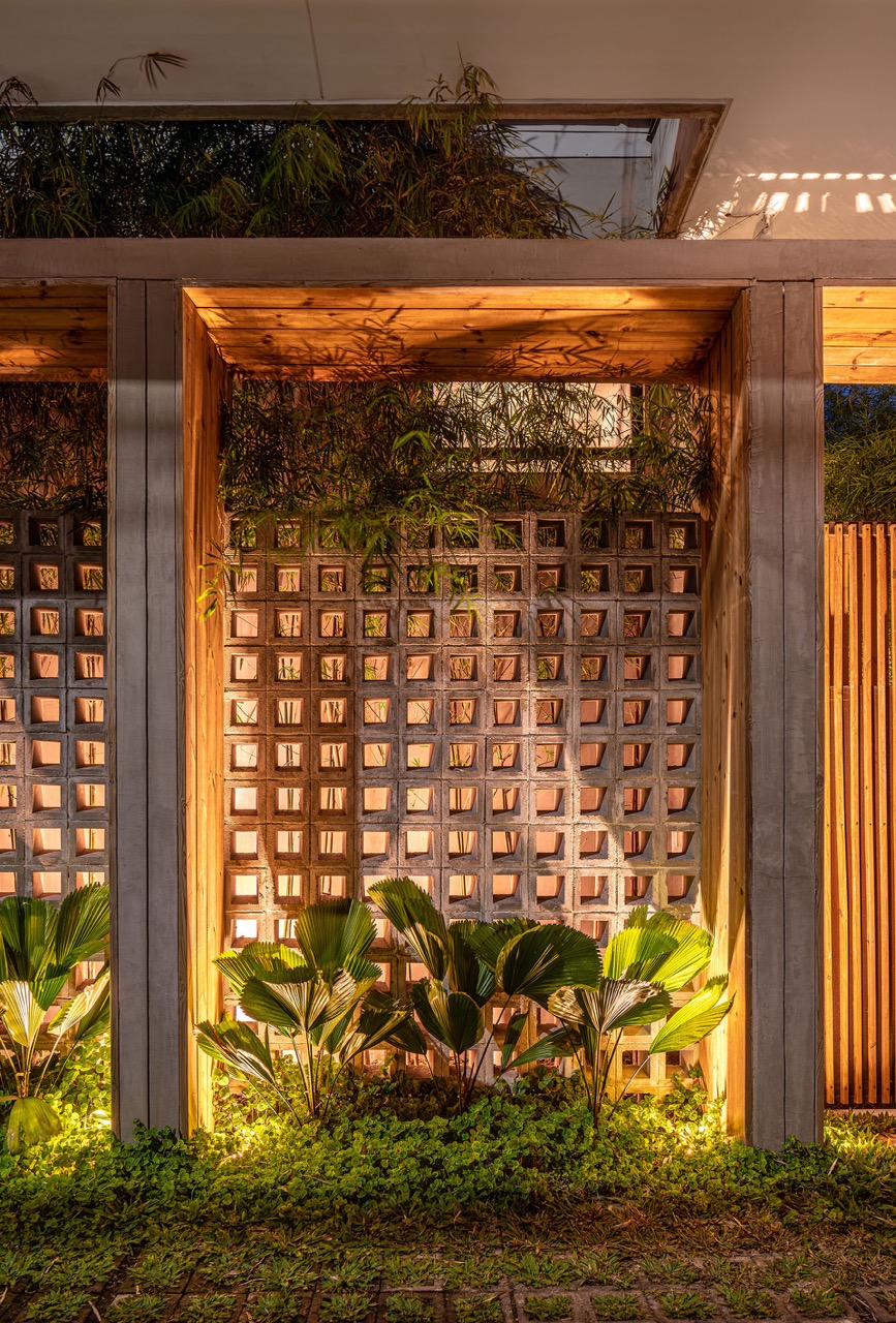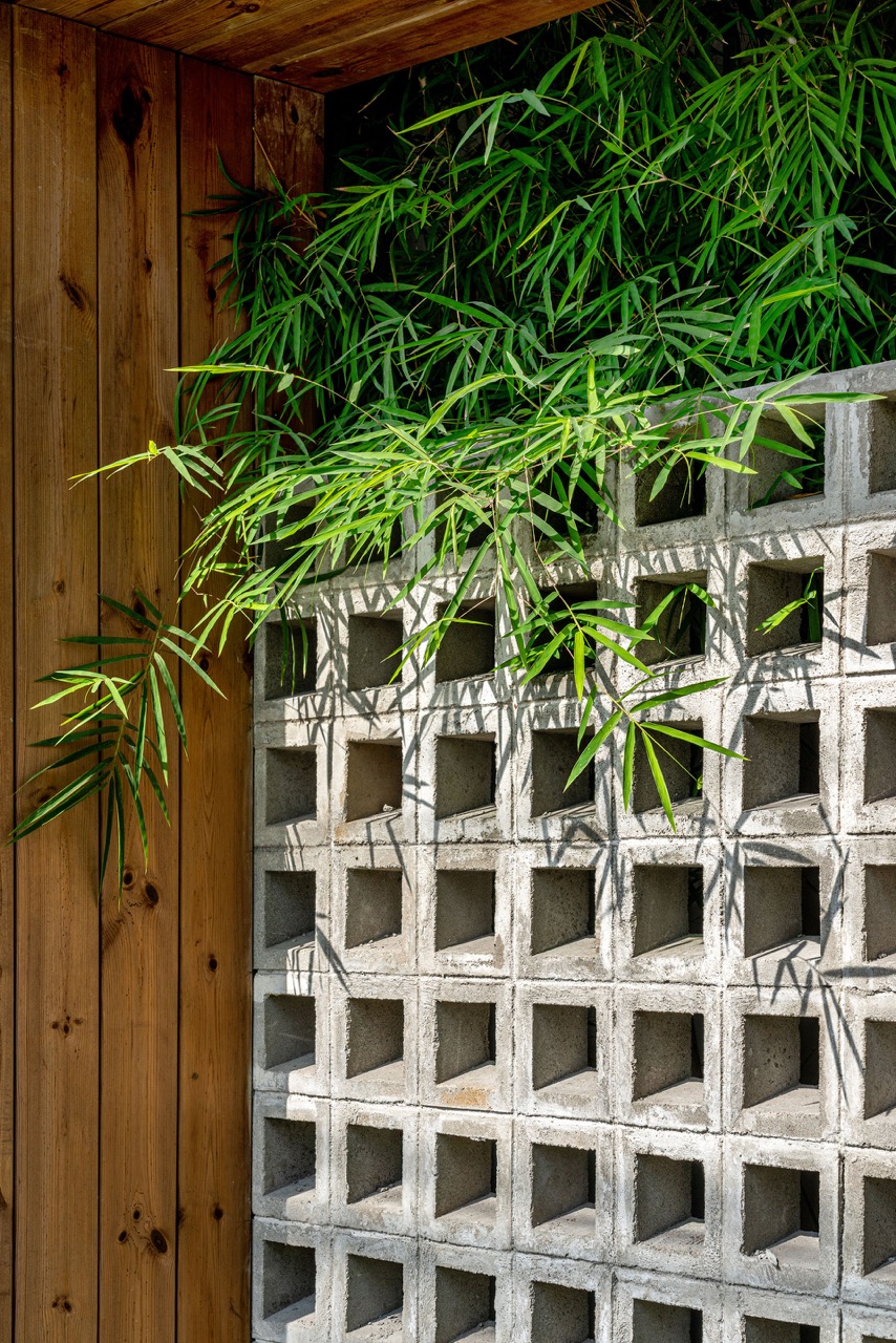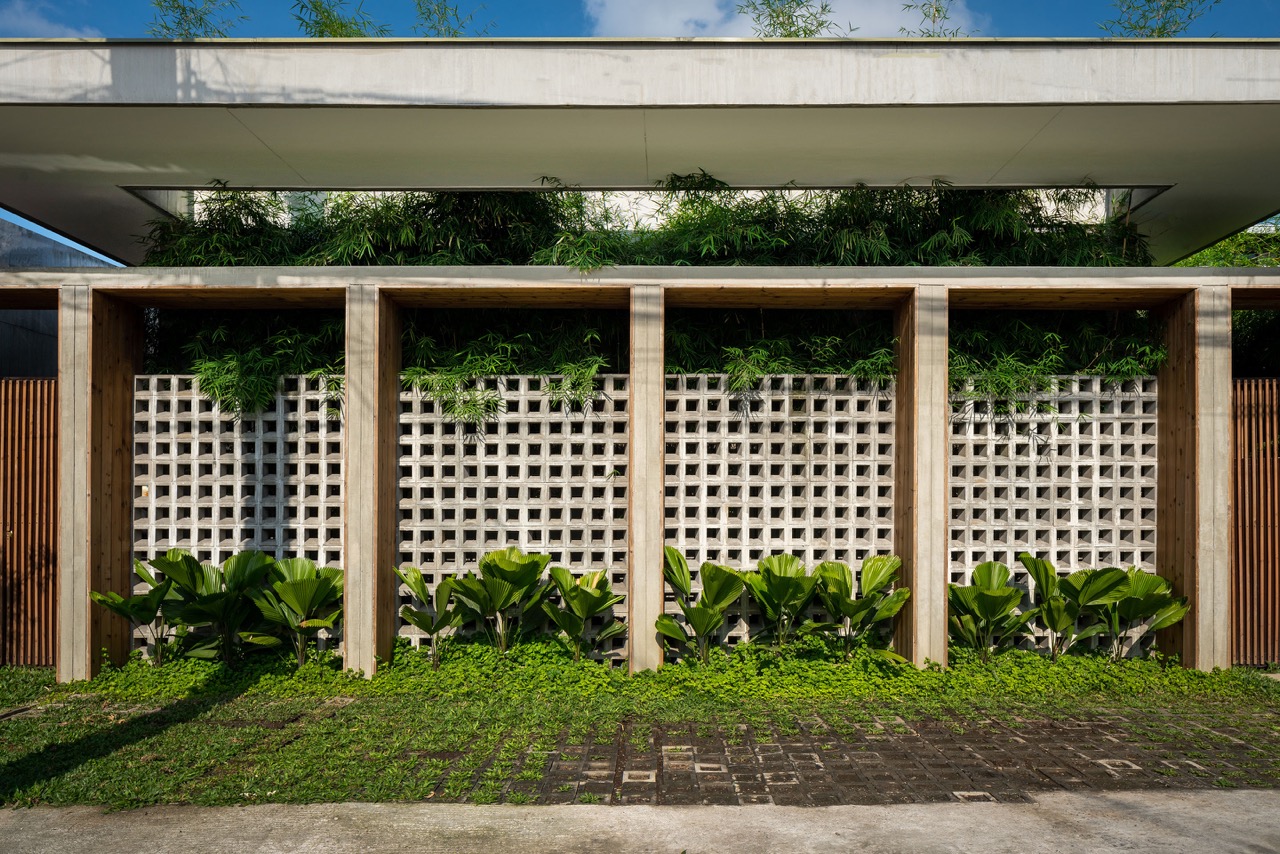 The facade’s “soft fence” is divided into 6 distinct rectangles formed by a timber outline that are filled with either a concrete breeze block or wood panel finish. It also acts as a screen that filters the sunlight and wind entering the site. Right above, a large concrete canopy extends over the fence providing shade, unifying the overall design.