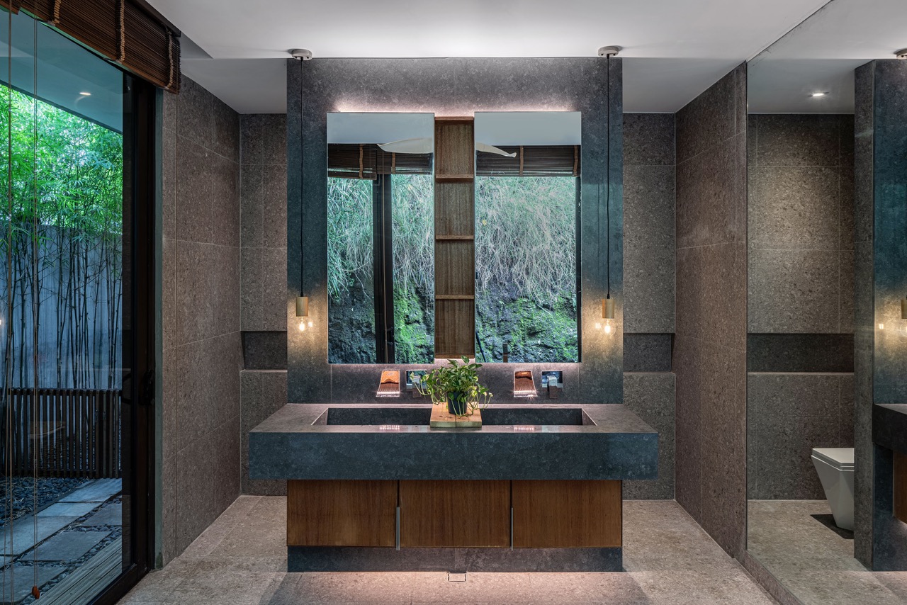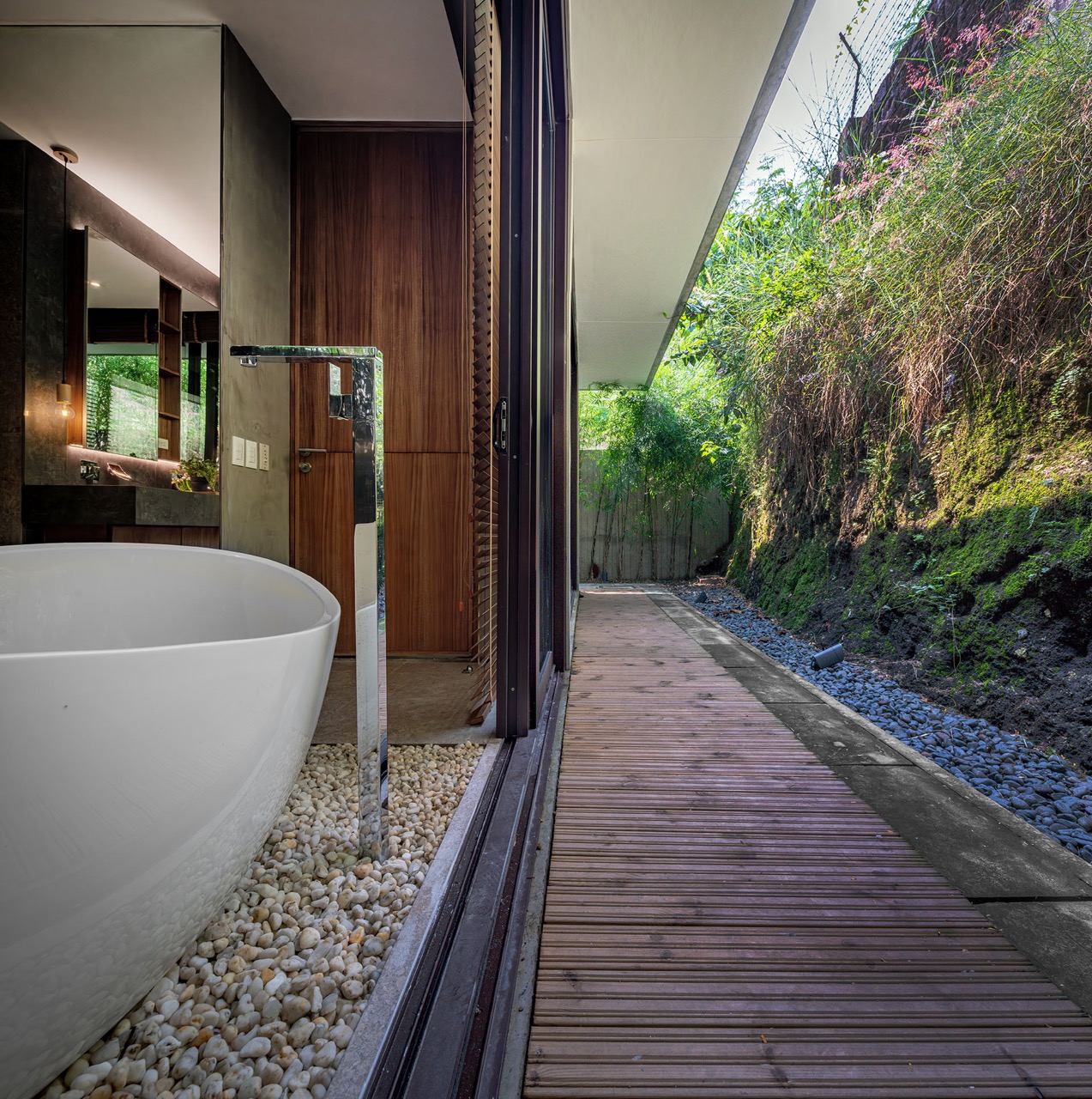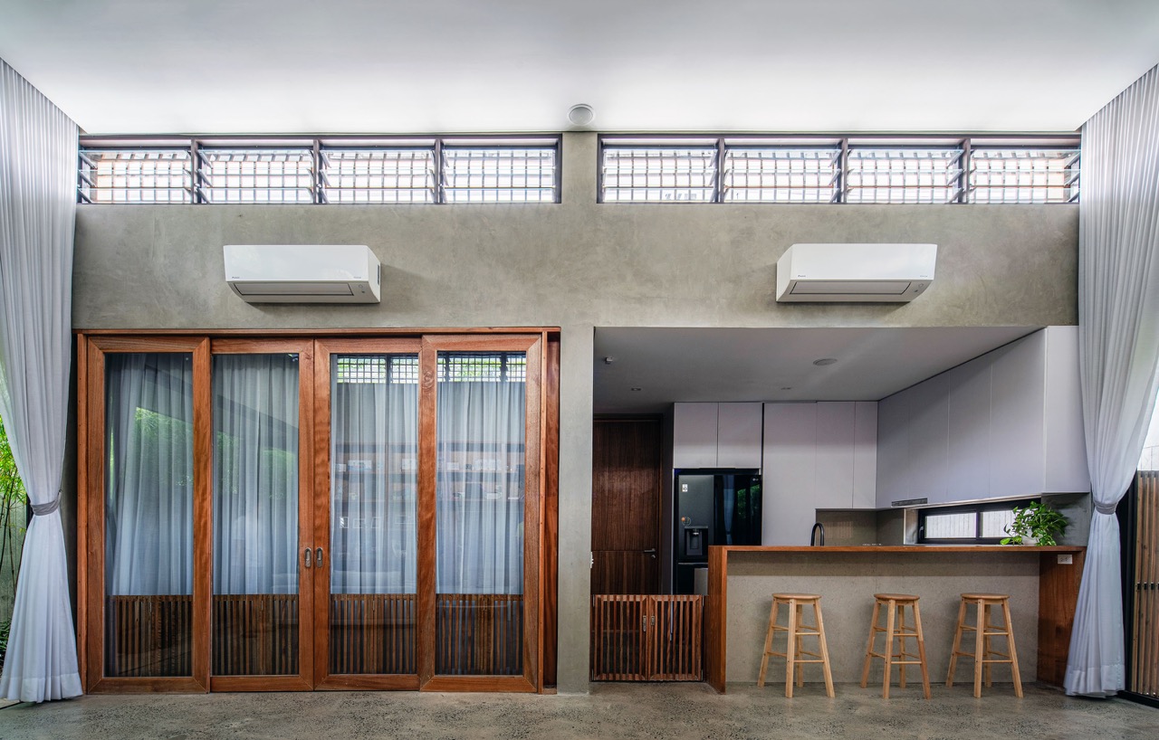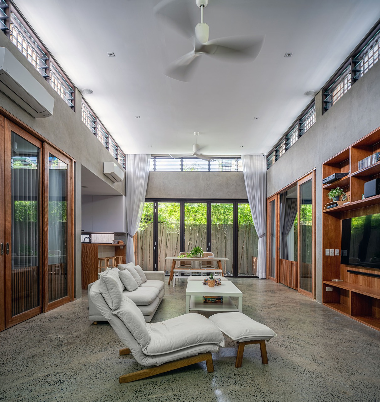 The choice of material and wood further accents the rhythmic pattern of balance and order already established so far. The warmth of wooden elements tastefully contrasts against the monotone colors of the exposed concrete walls and floors. The smoothness and properties of the flooring materials also makes it easier to clean and maintain. This interplay of materials creates a rich tapestry that contributes to the home’s tropical ambience and sleek modernity.