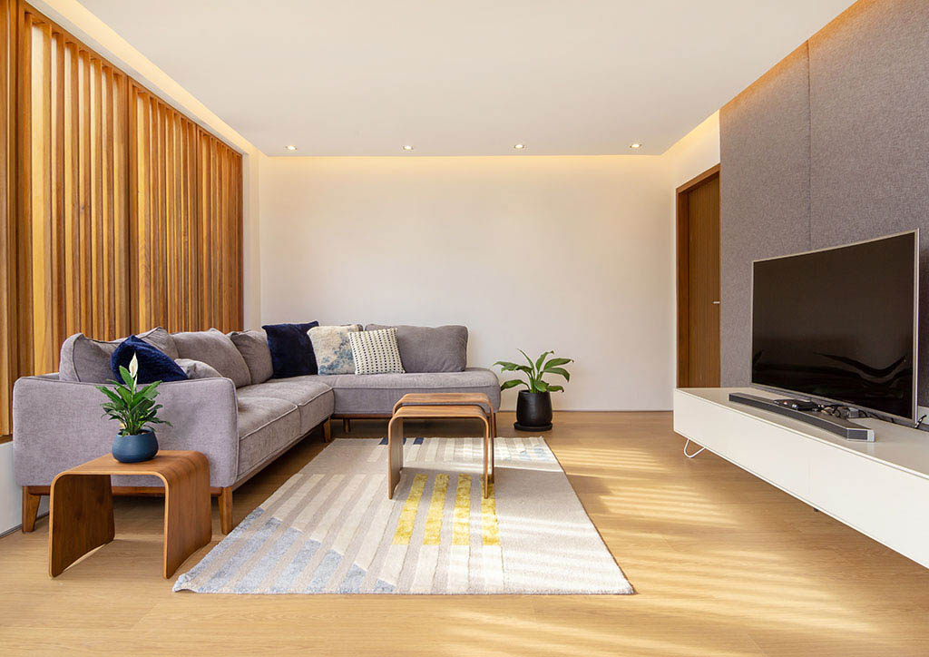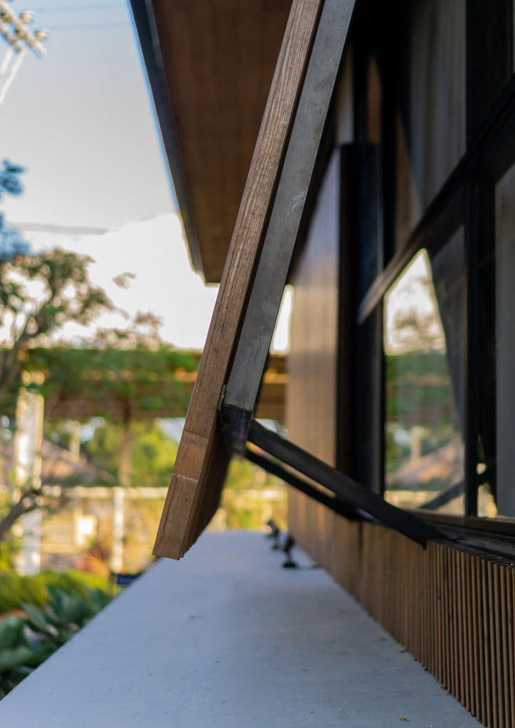 The ground floor has open-planned common areas. The lanai is connected to these common areas and serves as an extension of the space. All wood doors and accent wall panels found inside Bahay Sibi follow the same wood strip design, simulating the wood sun-shading devices of the exterior. The idea is to bring inside the exterior design, showing not only the spatial relationship but visual connections of the indoor and outdoor elements.