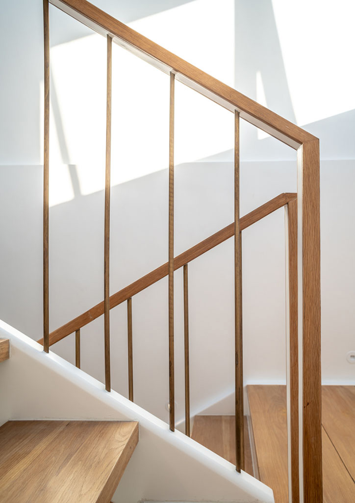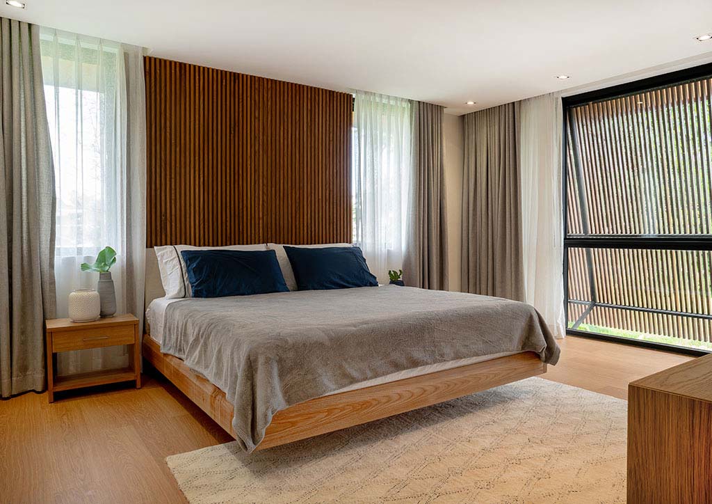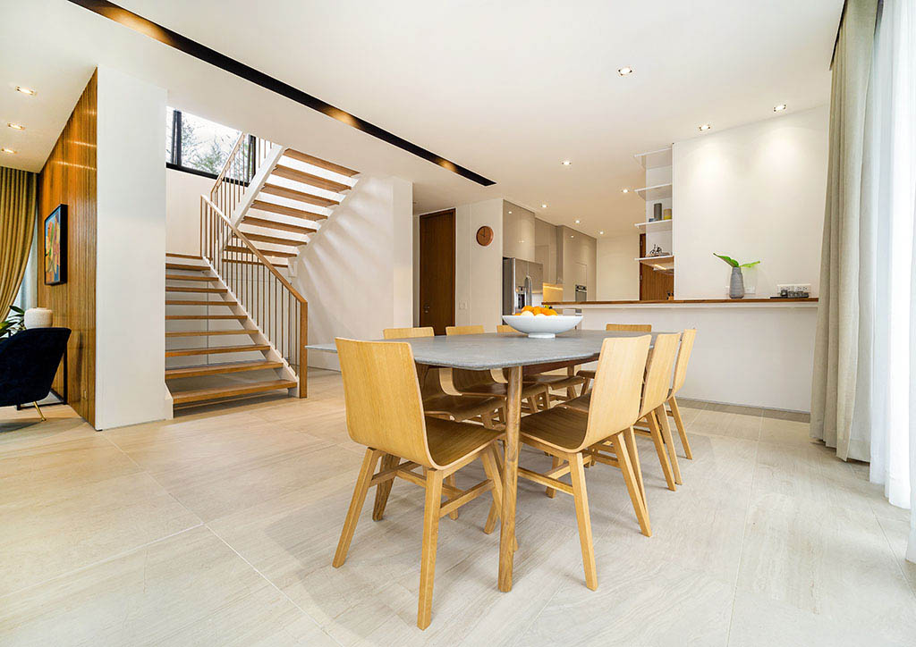 The palette of the interior is neutral, with accents of wood. The furnishings and accessories are minimal to have a relaxed ambiance and to avoid unnecessary clutter. The stairs connect the main spaces to the private rooms while permitting a stack effect that allows airflow and cross ventilation. The motorized windows on the stairs act as an exhaust for hot air. It also has a skylight with UV film, bathing the stairs with sunlight. The design of the stairs reflects the openness and porosity of the house while distributing sunlight to the common areas.