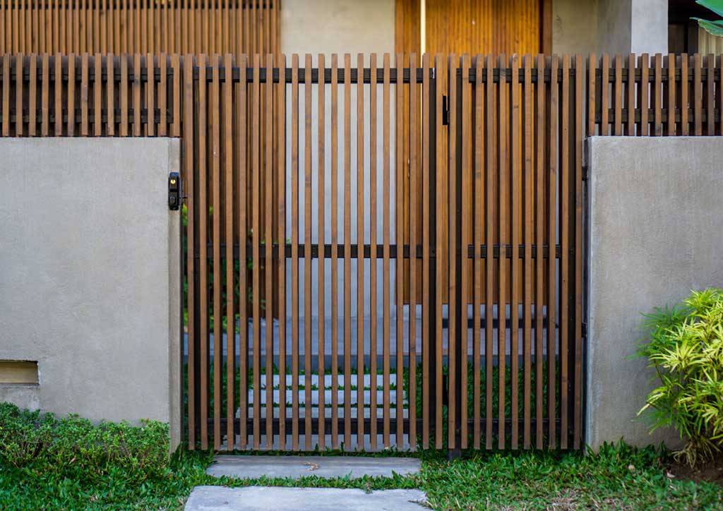 The house is accessed through a concrete path walk surrounded by tropical landscaping. Vegetation surrounds the house with a gabion fence bordering the property. Inside the galvanized steel gabions are limestones.