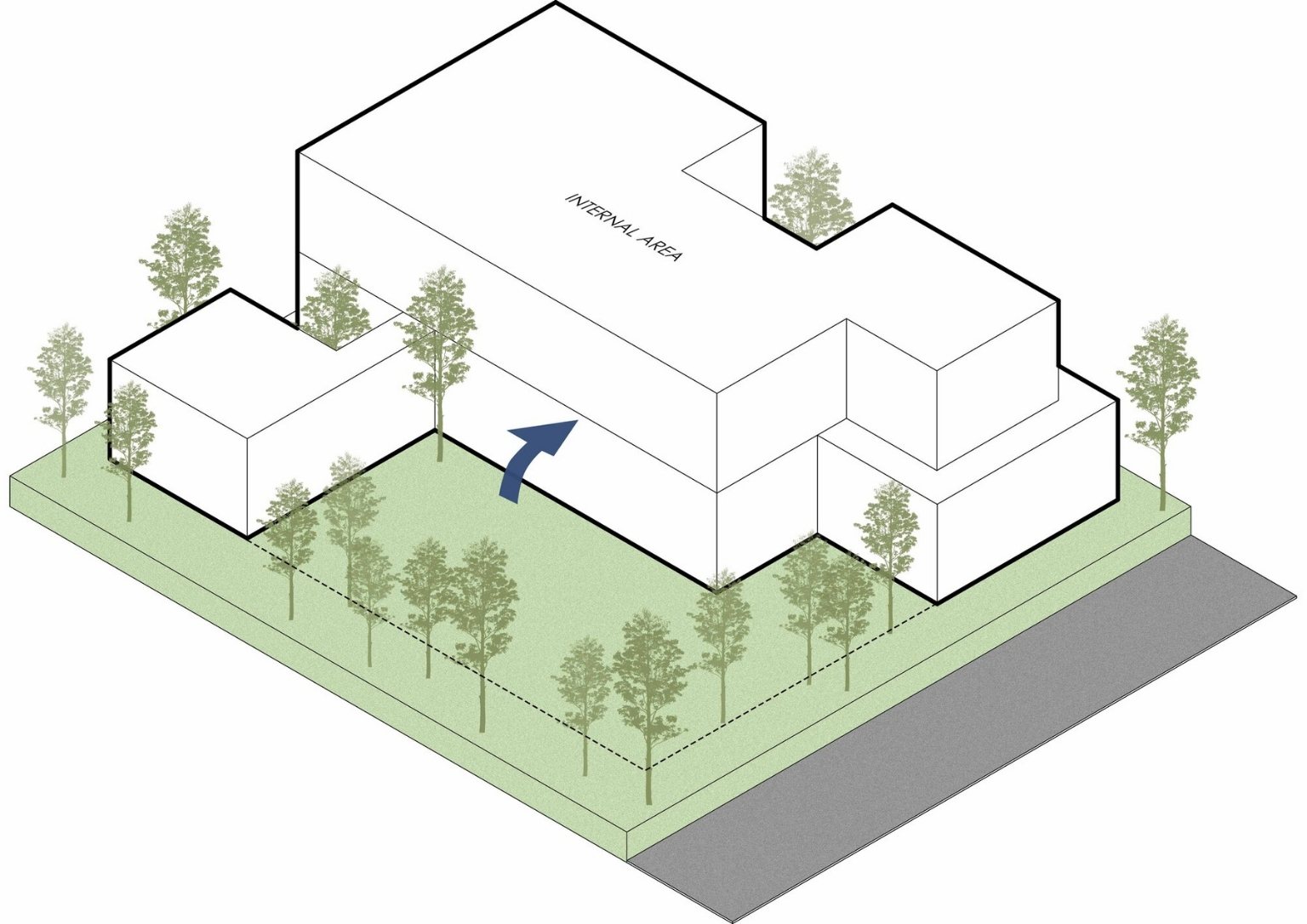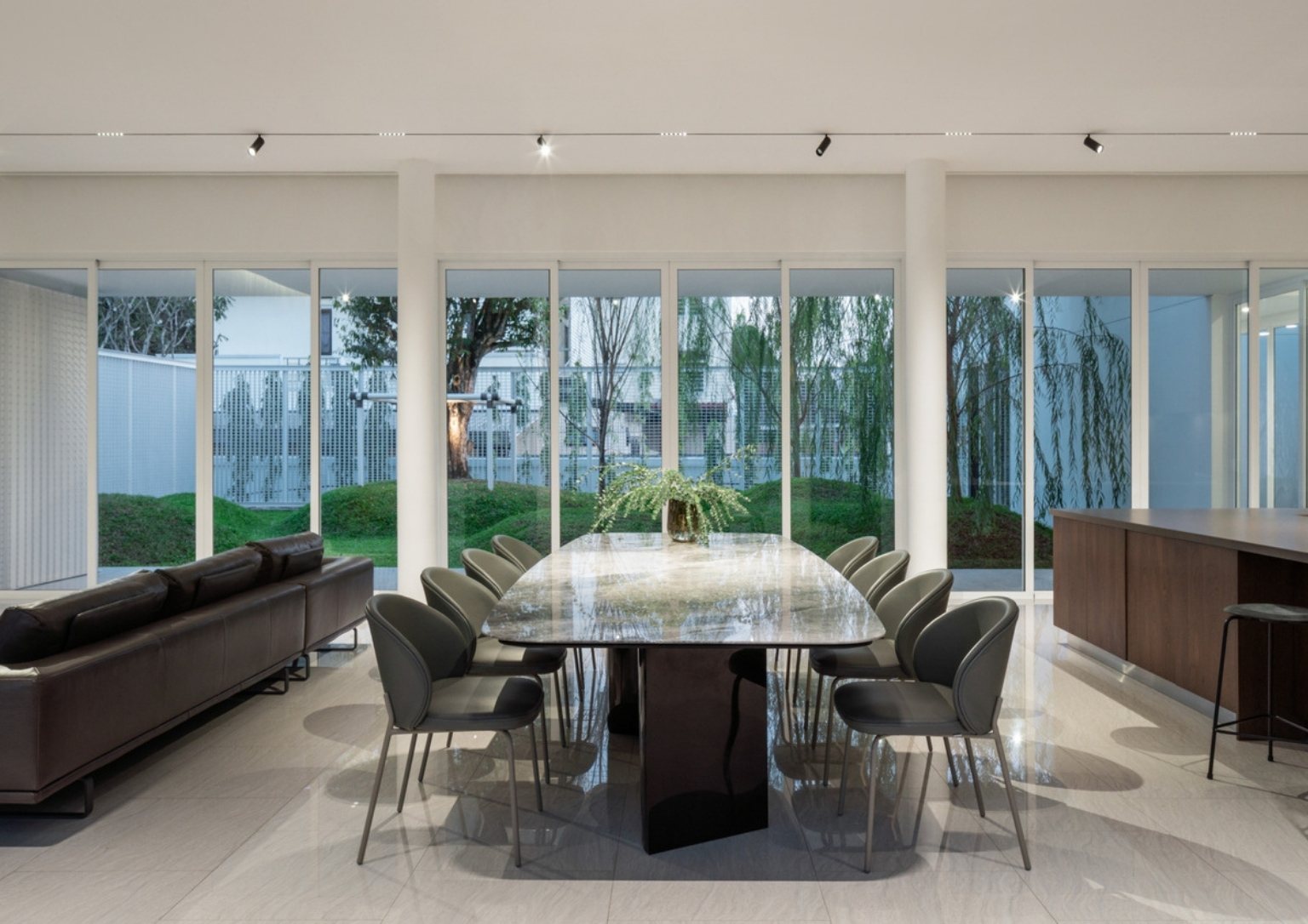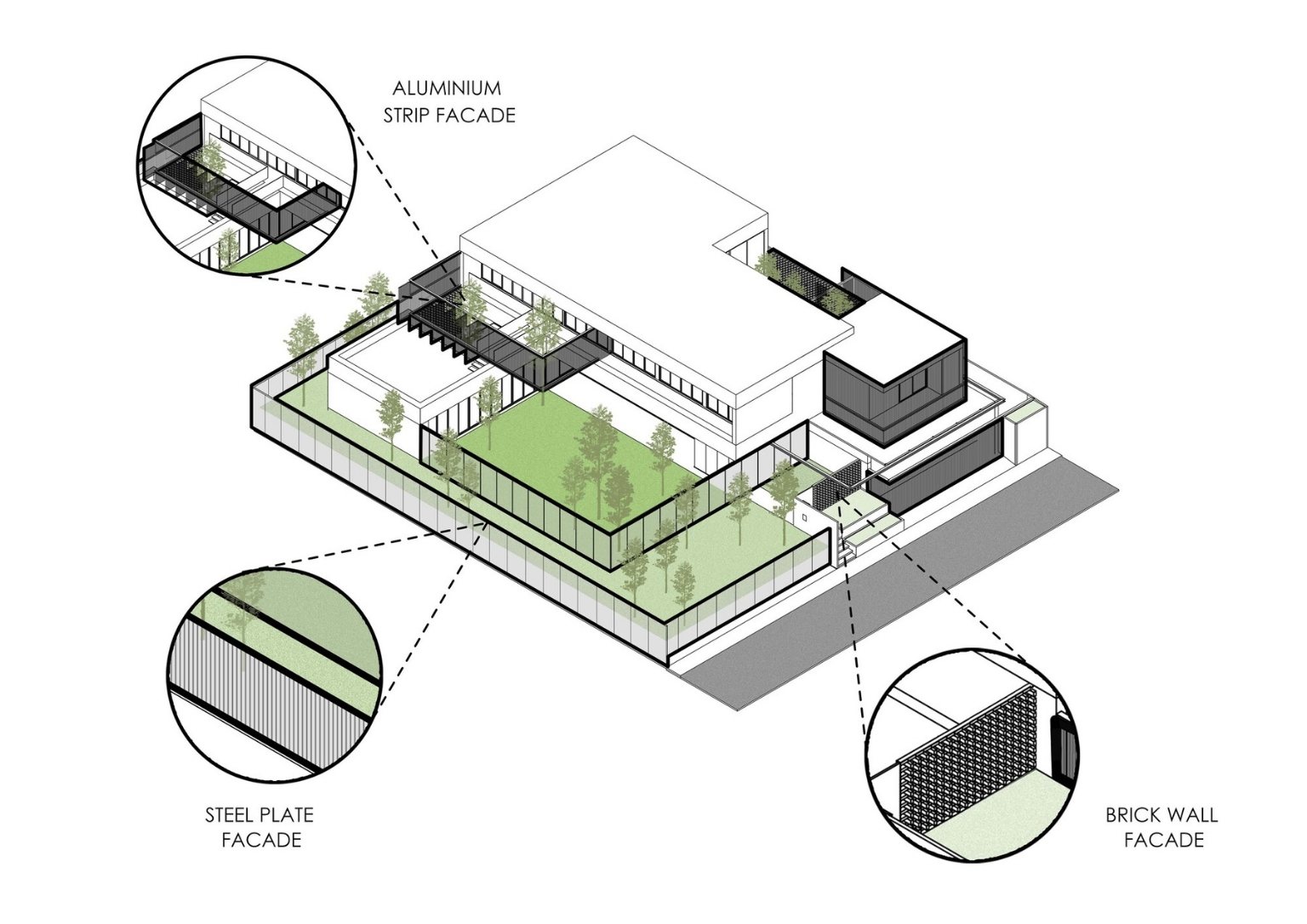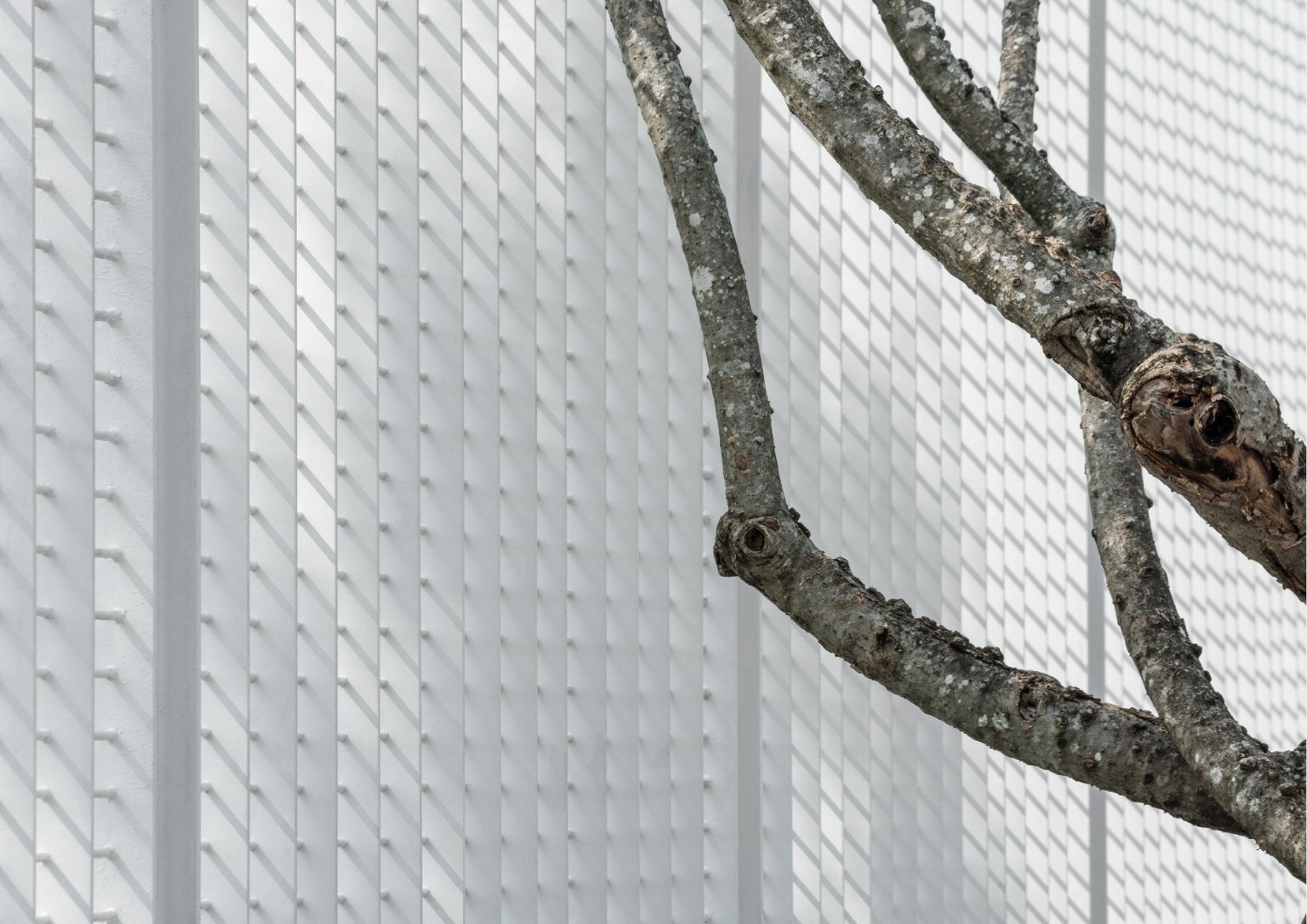 The architect has subdivided the greenspaces into courts, enclosed in facades and screens in different levels of pellucidity. “Like individual cloths, tailored to specific requirements, veiled over internal spaces, these specially laid walls and facades define exterior spaces where courts become “green rooms” interconnected with the interior volumes,” the architect explains.