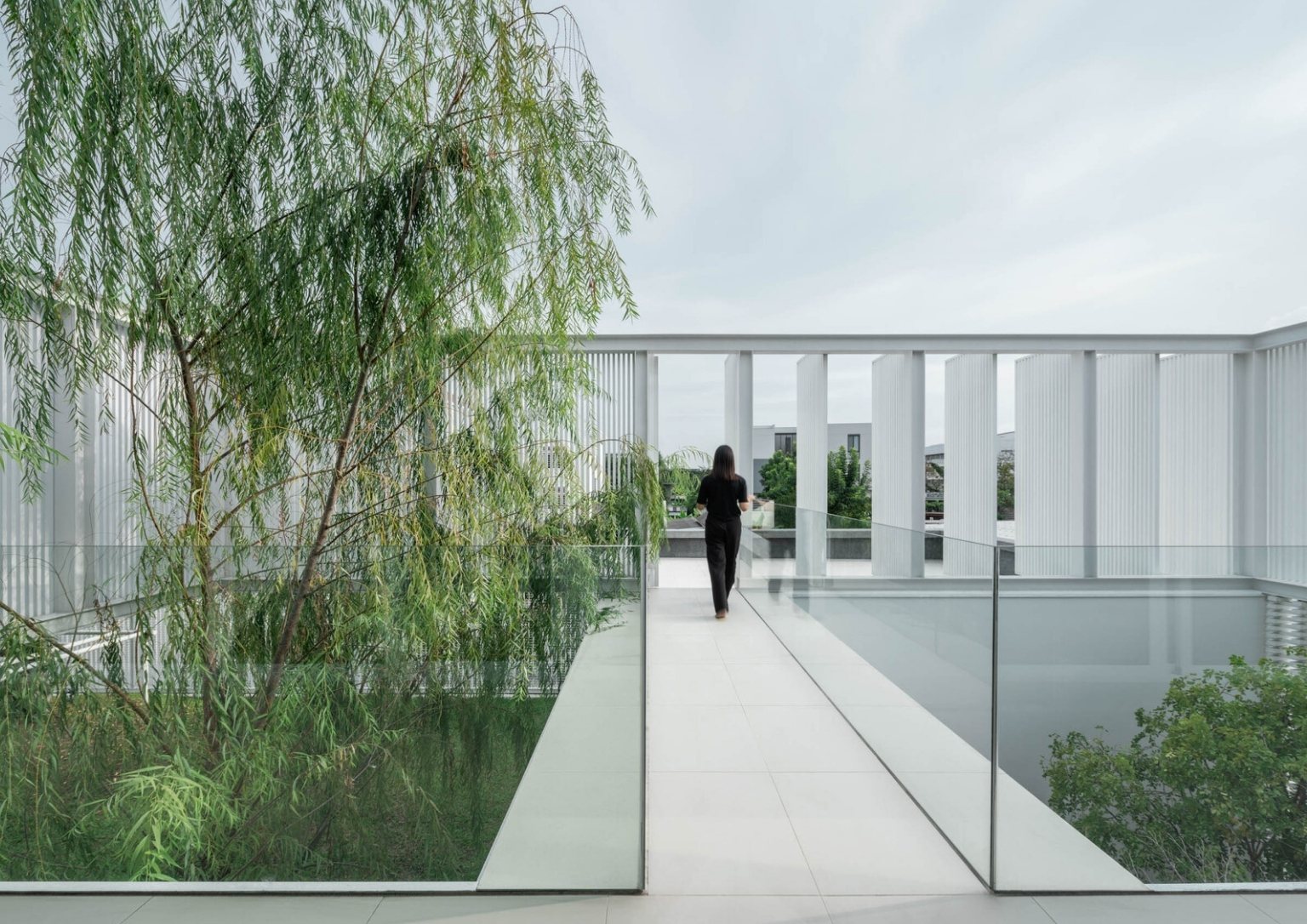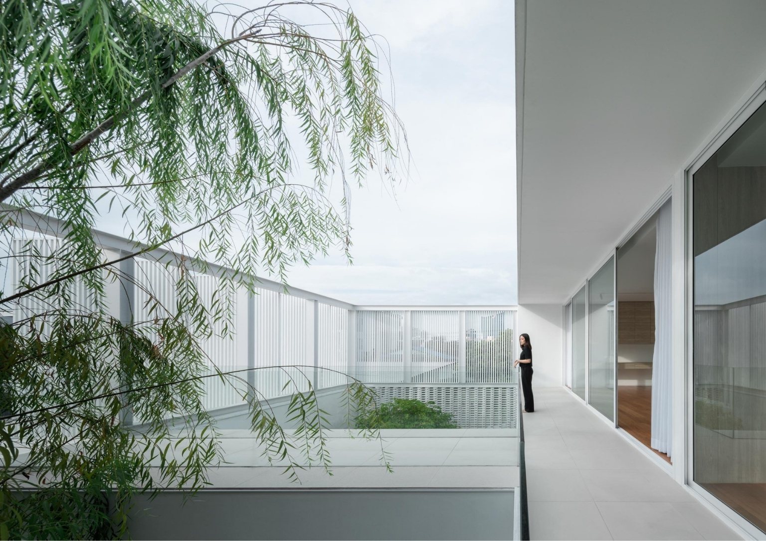 A bridge leading to a lowered terrace is placed in the foreground. On either side are swaying leaves coming from the downstairs court shared with the study and the Weeping Willow forming the midground. Occupants can see the central trees in the distance through the screen. According to the architect, this view is permanent, unwavering, and uncompromising because the screens ensure complete privacy. No blinds are required.