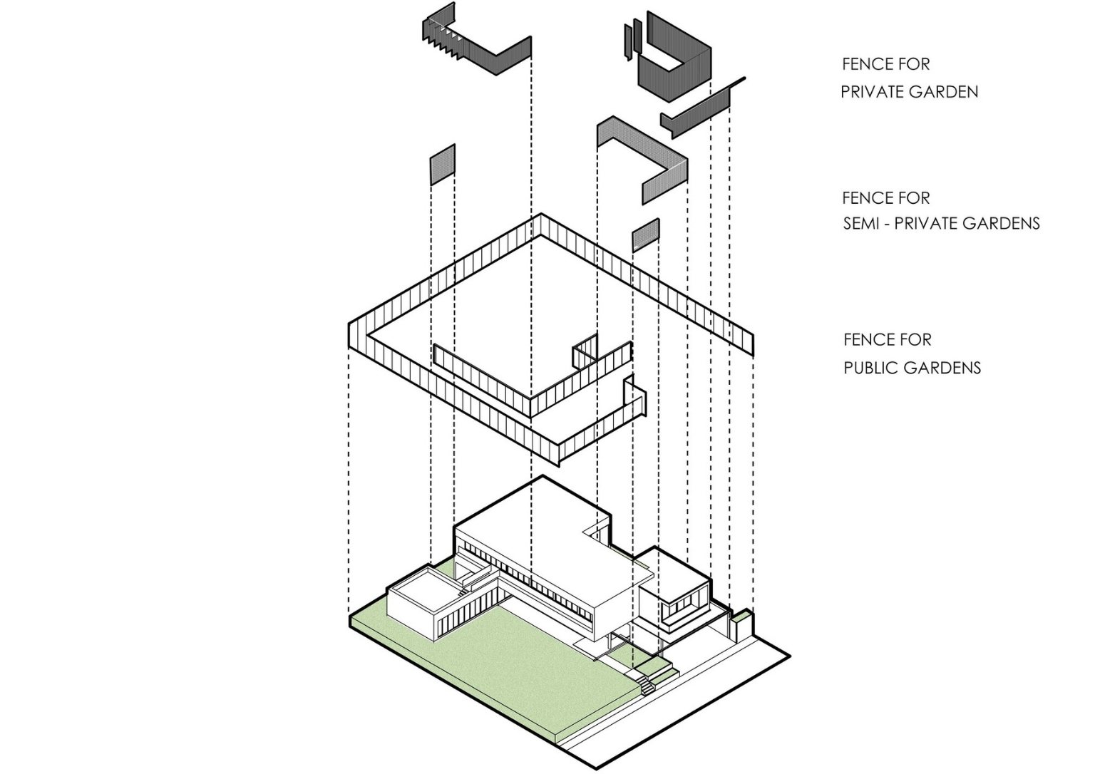 The Semi-Public Gardens paved in gravel are accessible through the main gate. The grounds are designed to be trodden on and have been raised so that people in the garden could look over the parapet to interact with those on the road and neighbors across.