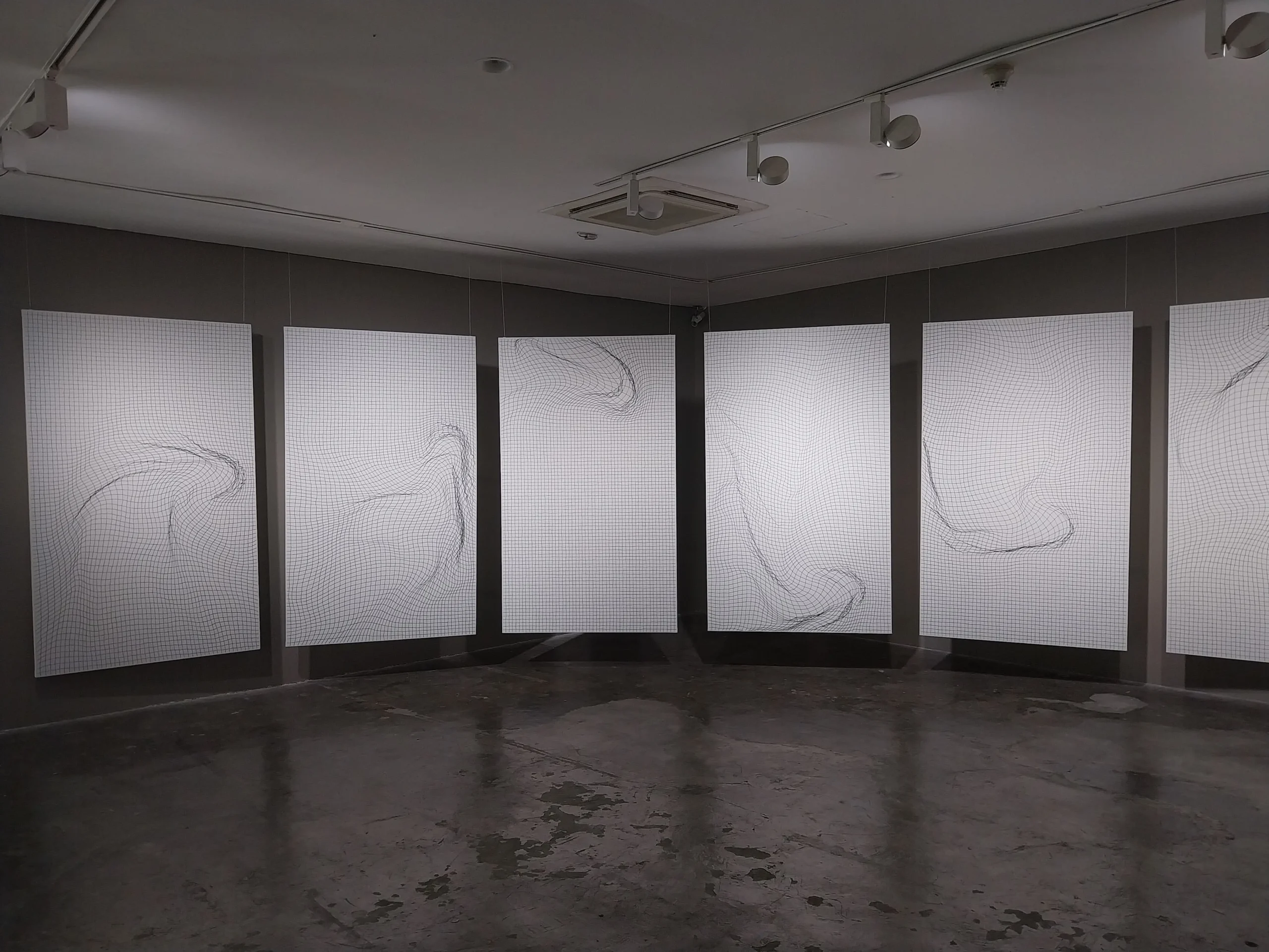A series of twelve massive panels of needlework done on white Aida cloth, Celine Lee utilizes the space of the gallery to create a giant wave-like pattern, seemingly crashing up and down as it sought to portray the different physics dynamics of space and time.